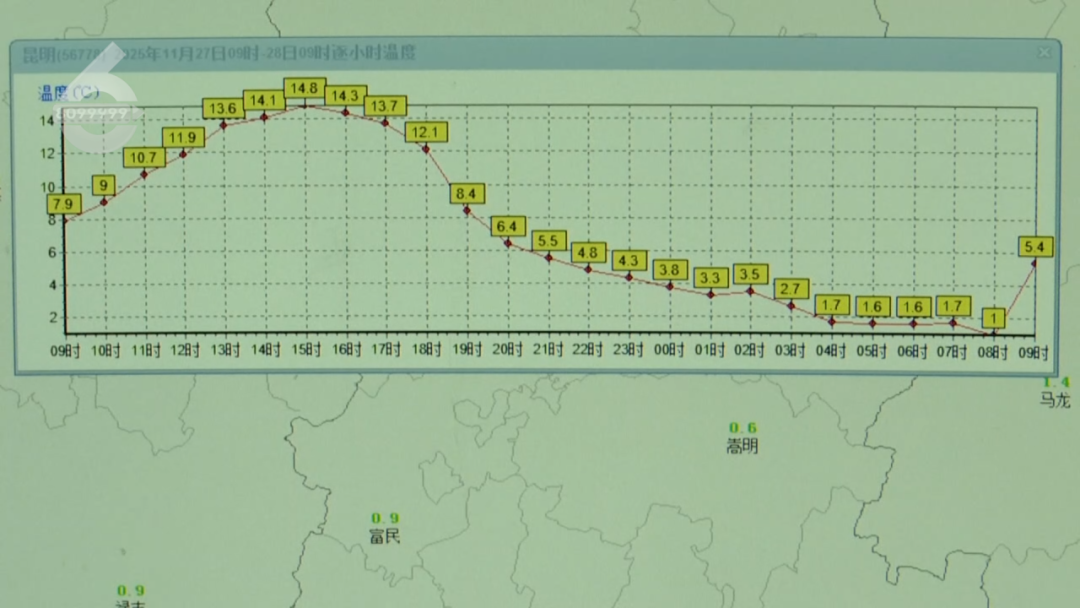 昆明市气象台台长、首席预报员李晓鹏介绍,最近这段时间,昆明的最低气温较常年偏低了2~3℃,昼夜温差超过10℃,因此寒意比往年同期更明显。在昆明一些高海拔地区和郊区,最近的早晚最低气温基本在0℃或0℃以下。