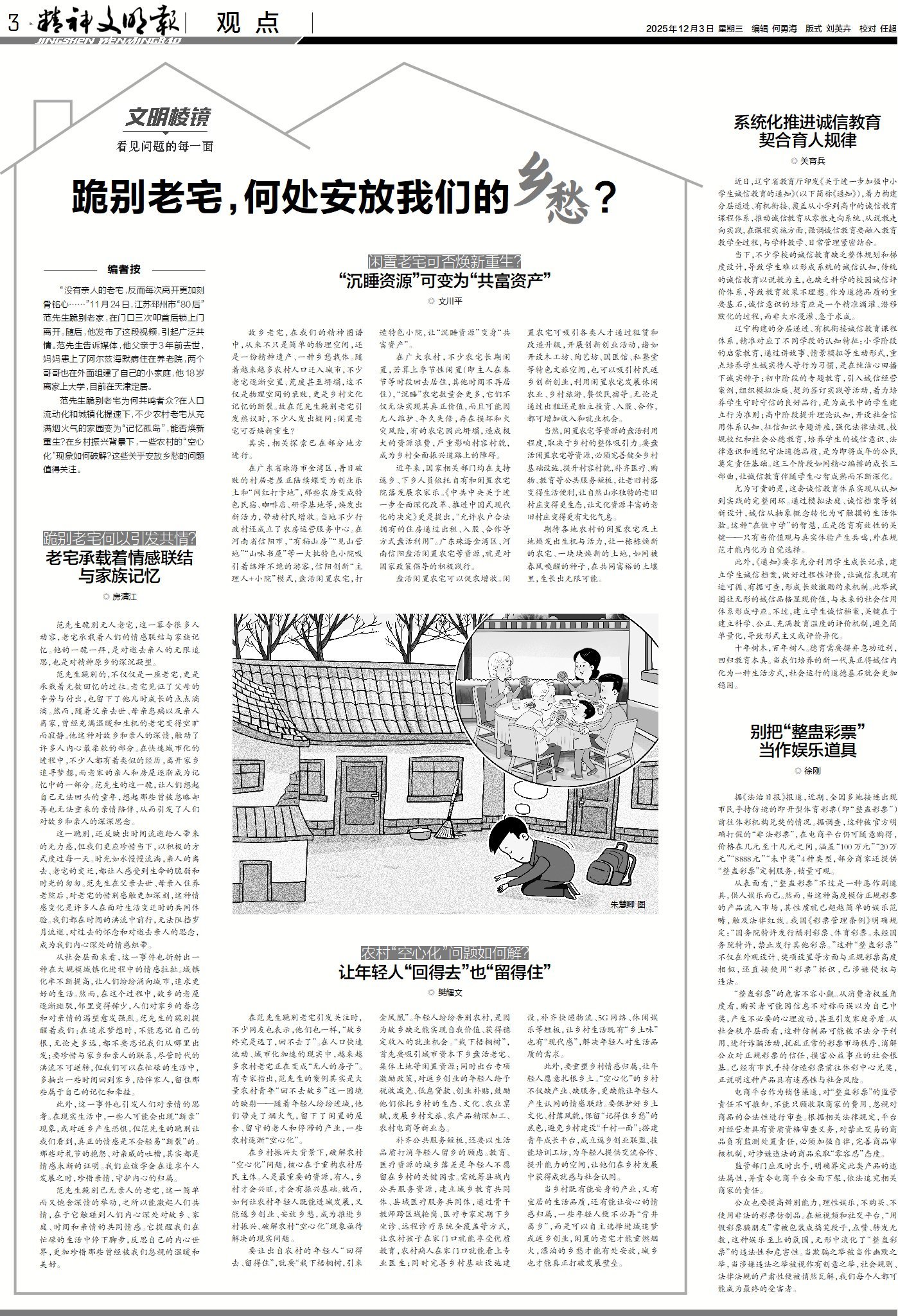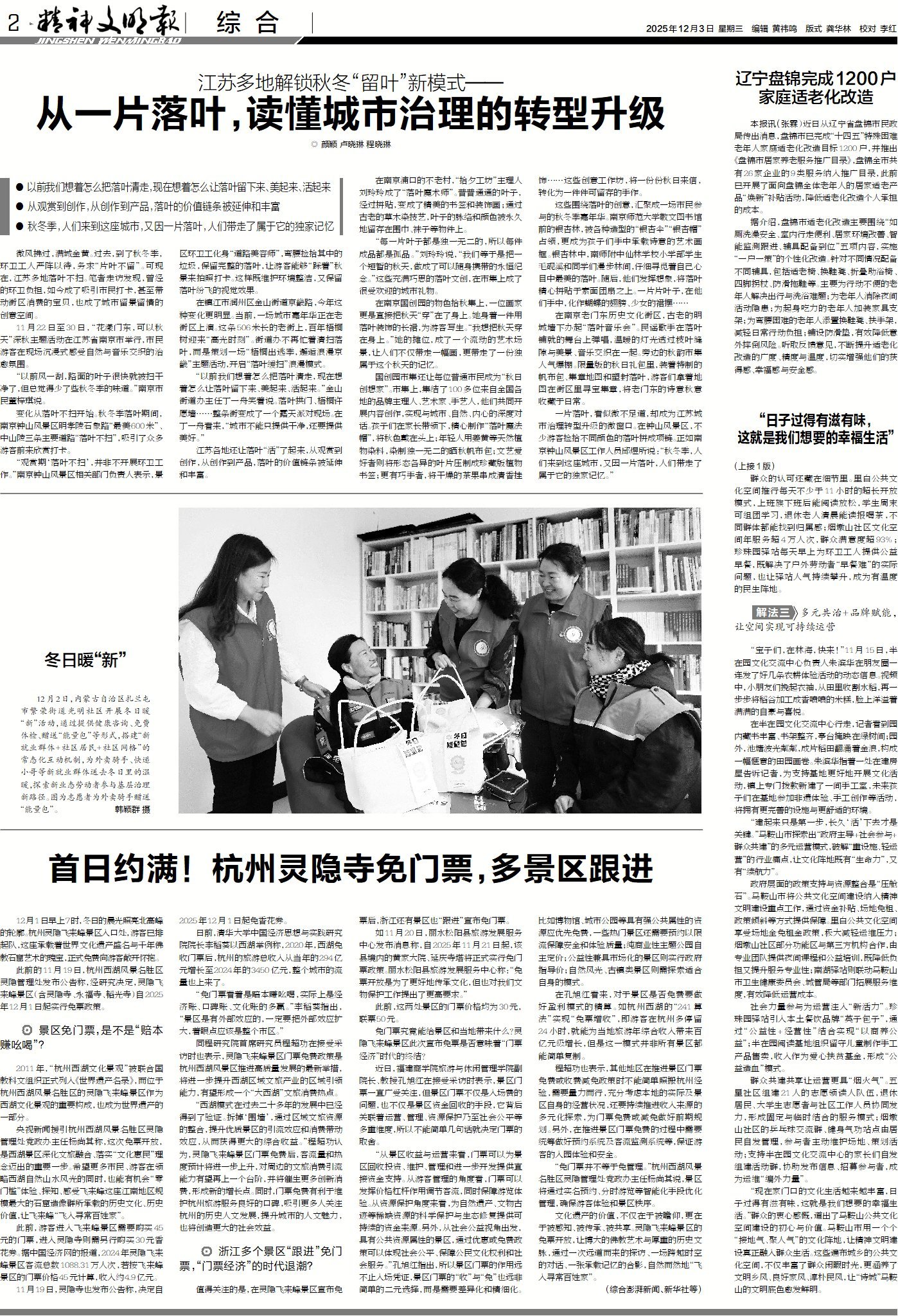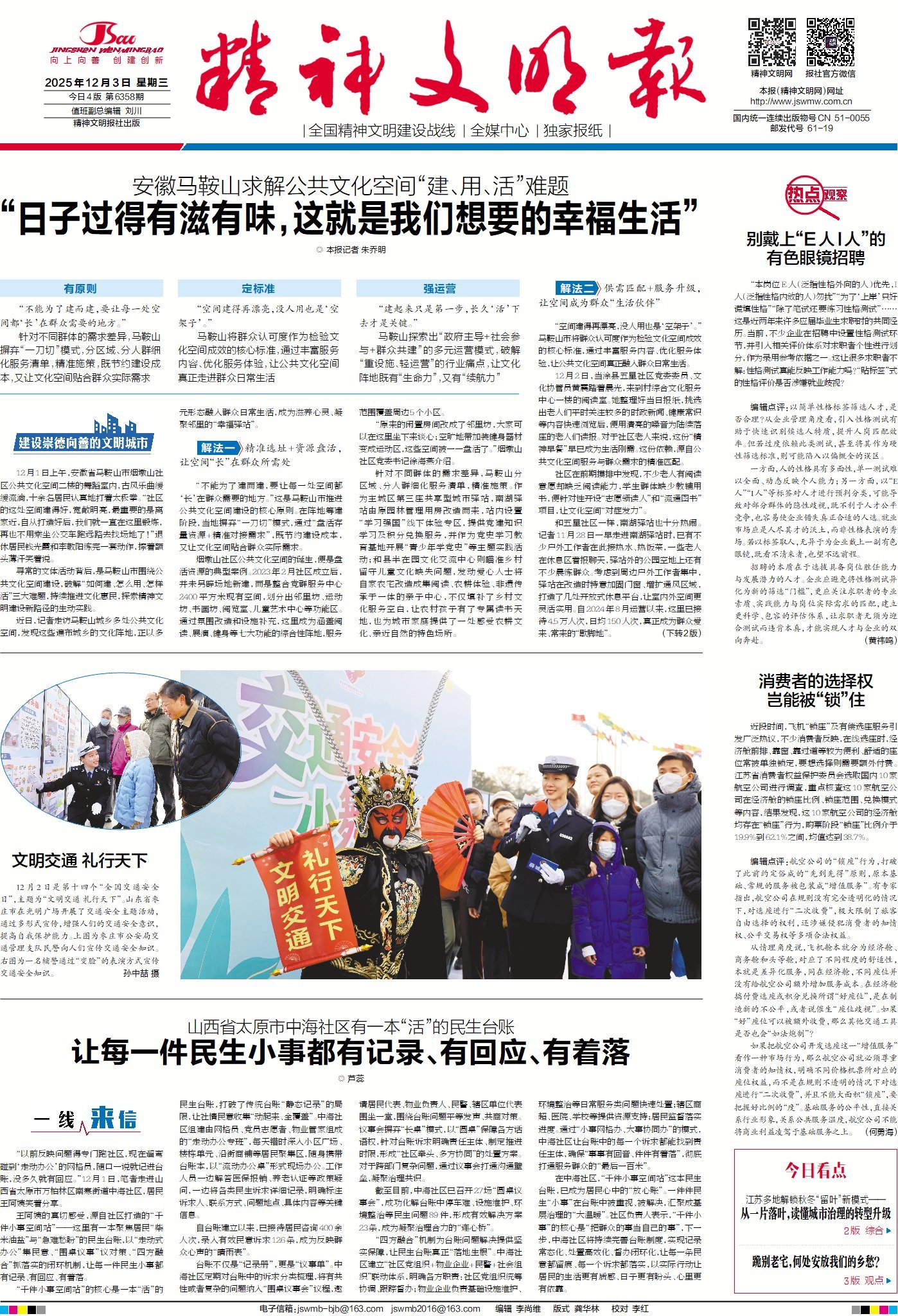今日版面“早”知道:1版头条聚焦安徽马鞍山求解公共文化空间“建、用、活”难题,贴合群众需求,走进群众生活;《热点观察》栏目关注企业招聘设置“E人I人”性格测试,分类背后可能存在隐性歧视和就业不公;航空公司“锁座”后包装成“增值服务”,规则不透明情况下的消费者权益如何保护?2版综合版带你探秘江苏多地解锁秋冬“留叶”新模式,读懂城市治理转型升级;3版《文明棱镜》栏目探讨无人居住的老宅如何安放乡愁?农村“空心化”现象如何破解?