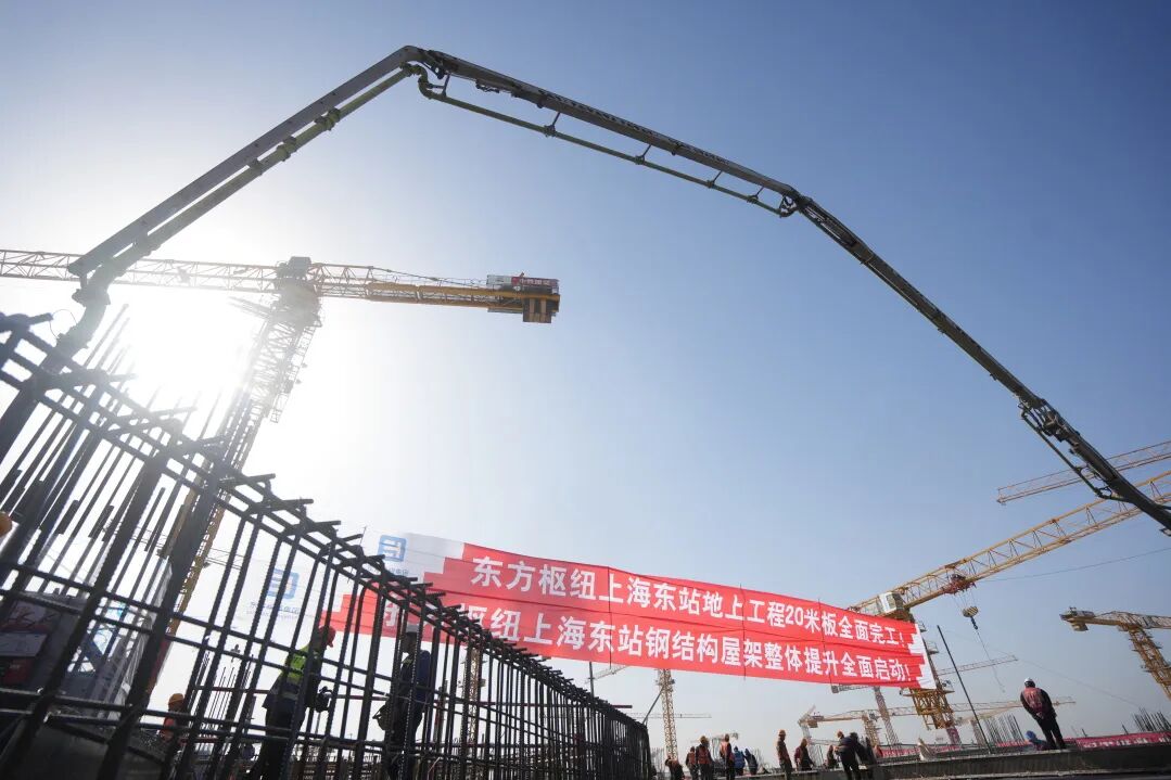 主站房及南北咽喉区混凝土主体结构全面封顶,是项目建设历程中又一个重大里程碑事件,不仅能发挥站场“防护罩”作用,保障盖下承轨层及地面层项目施工安全,也意味着向上海东站高质量建成投运的目标,又迈出了关键一步。