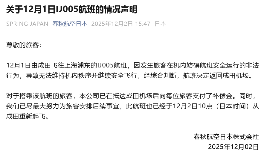 12月2日,春秋航空日本株式会社发布关于12月1日IJ005航班的情况声明:
