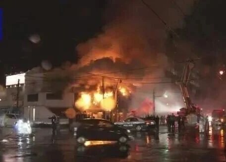 警方表示,起火点位于一栋两层建筑内,该建筑内有不动产公司等机构。目前火势已延烧至相邻建筑。