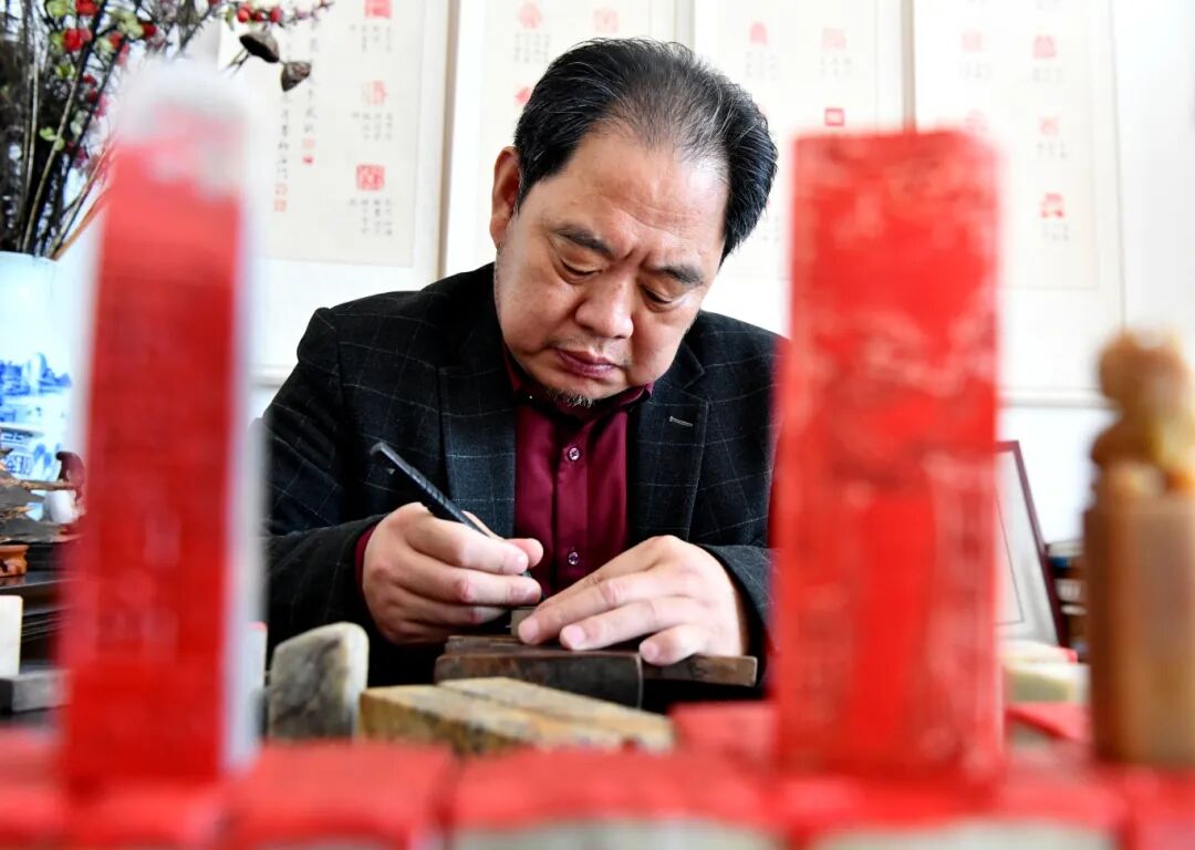 “传承不只是家学,更是使命。”耿玉峰摩挲着印石,目光坚定,“希望年轻人既能学会技艺,又能透过刀锋读懂文化之美,让这门古老艺术‘印’在掌心、刻在心间。”磨石、写稿、镌刻,日复一日的坚守中,耿氏篆刻正以匠心与创新,让千年文脉在当代焕发新生。