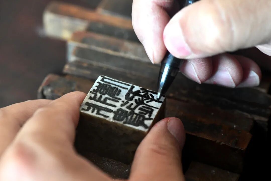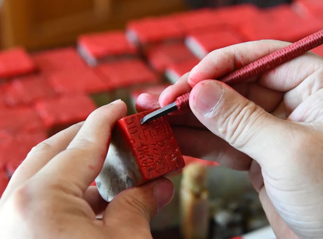 青田石在细磨下泛起温润柔光,石材的清冽混着印泥的醇香萦绕鼻尖,沁人心脾……