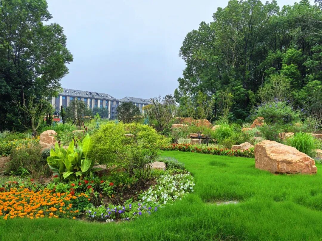 此次打造的花境以“大地欢歌,锦绣山河”为设计理念,充分利用原有地形高差,用岩石堆叠打造艺术化自然护坡,以岩石的刚毅质感映衬植物的柔美姿态,勾勒出自然和谐的生态画卷。在植物搭配上,精选乡土及适应性强的品种,依托现有背景林,中层穿插红枫、桂花等兼具观赏与芳香价值的树种,底层大面积栽植宿根花卉和观赏草,构建形成错落有致的地被景观,实现了春季迎春吐露芬芳,夏季石竹绚烂绽放,秋日菊花装点秋色,冬季火棘艳红夺目“全年有绿、三季有花”的景观效果,让“临时空地”成功转型为可持续的生态景观节点。
