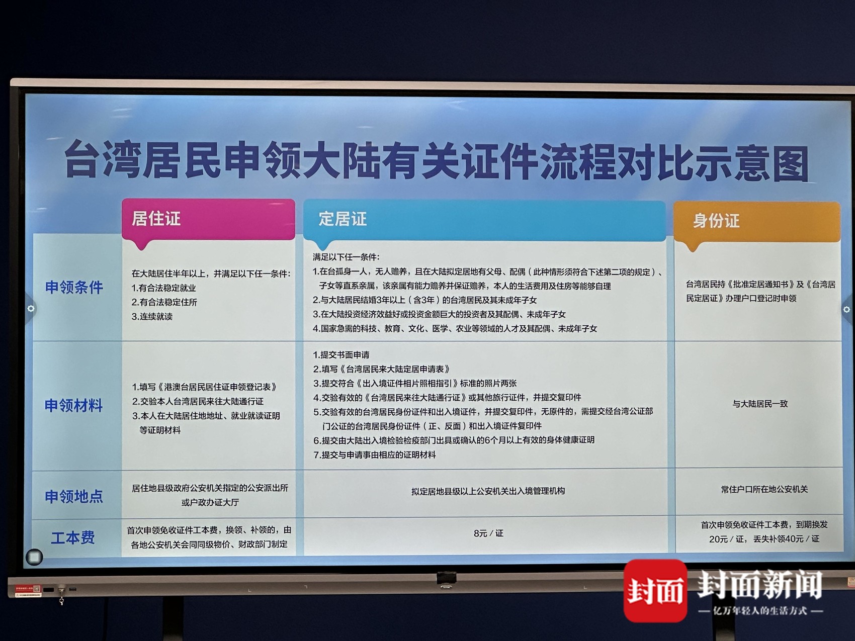 国台办新闻发布会上展示的“台湾居民申领大陆有关证件流程对比示意图”。封面新闻记者戴云 摄