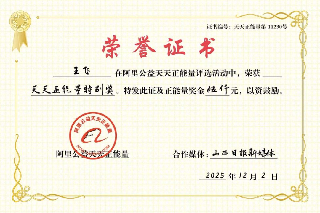 12月2日,阿里巴巴公益“天天正能量”平台联合山西日报新媒体,为王飞颁发“天天正能量特别奖”及5000元正能量奖金。颁奖词中这样写道: