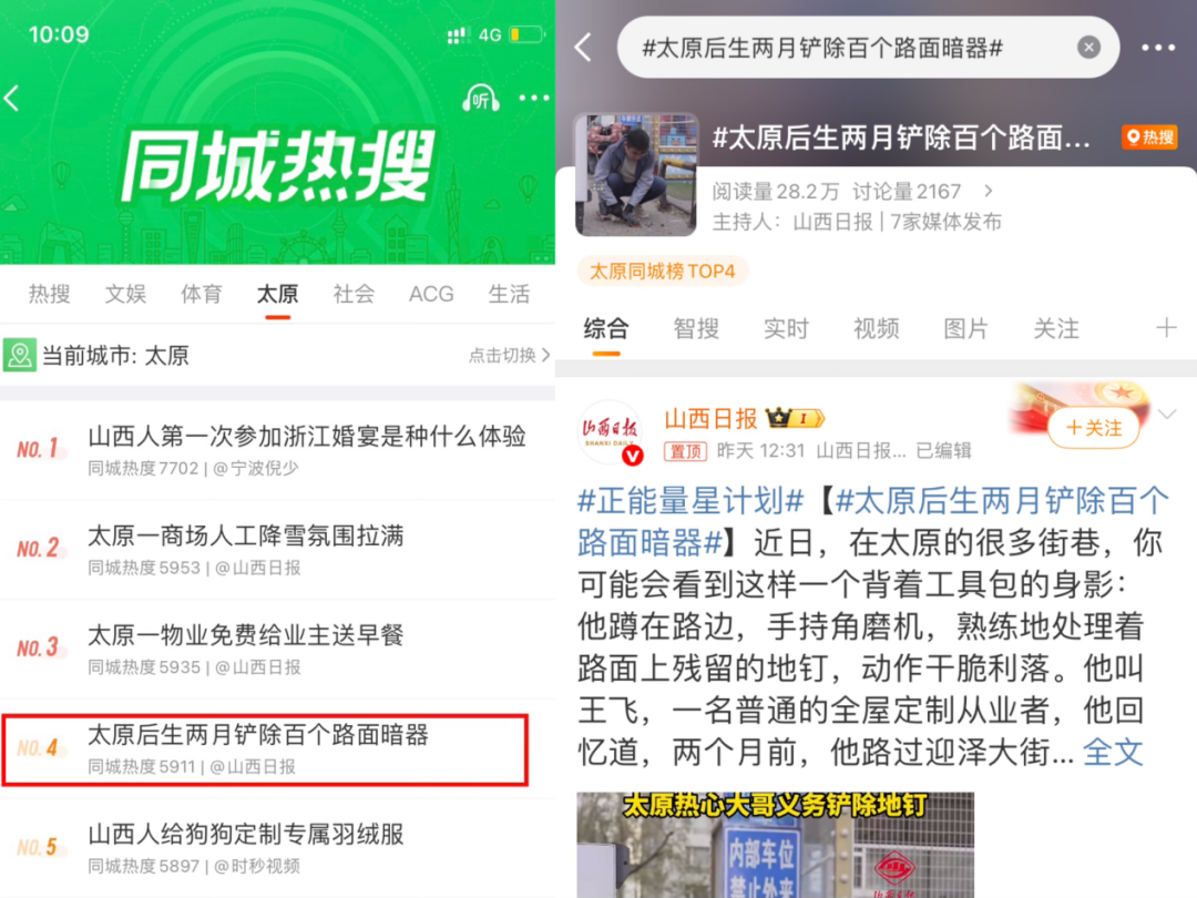 报道发布后,迅速在网络引发强烈反响。山西日报微博主持发布的相关话题 #太原后生两月铲除百个路面暗器# 登上太原同城热搜榜第四位,阅读量突破28.2万,讨论量达2167次,另有7家媒体参与发布,引发持续关注与转发。