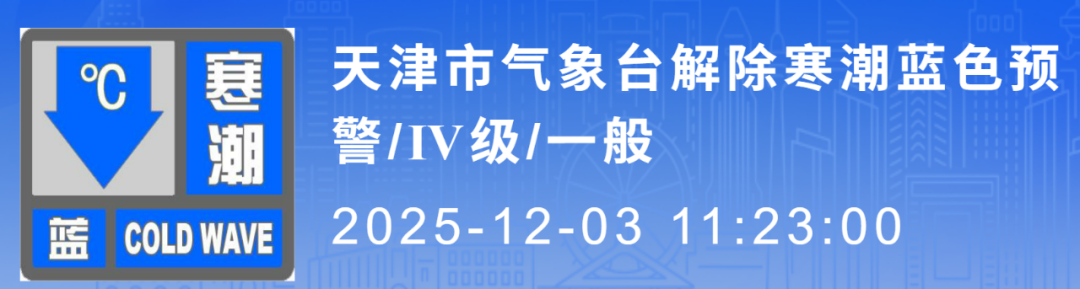 天津市气象台于2025年12月03日11时23分解除寒潮蓝色预警信号:目前影响天津地区的强冷空气已经基本结束,寒潮蓝色预警信号解除。