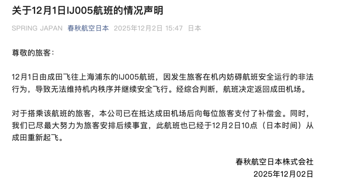 12月2日,春秋航空日本株式会社发布“关于12月1日IJ005航班的情况声明”——