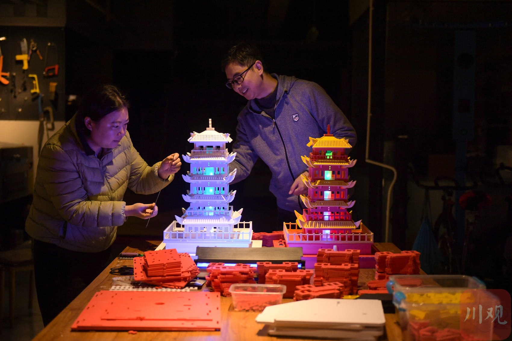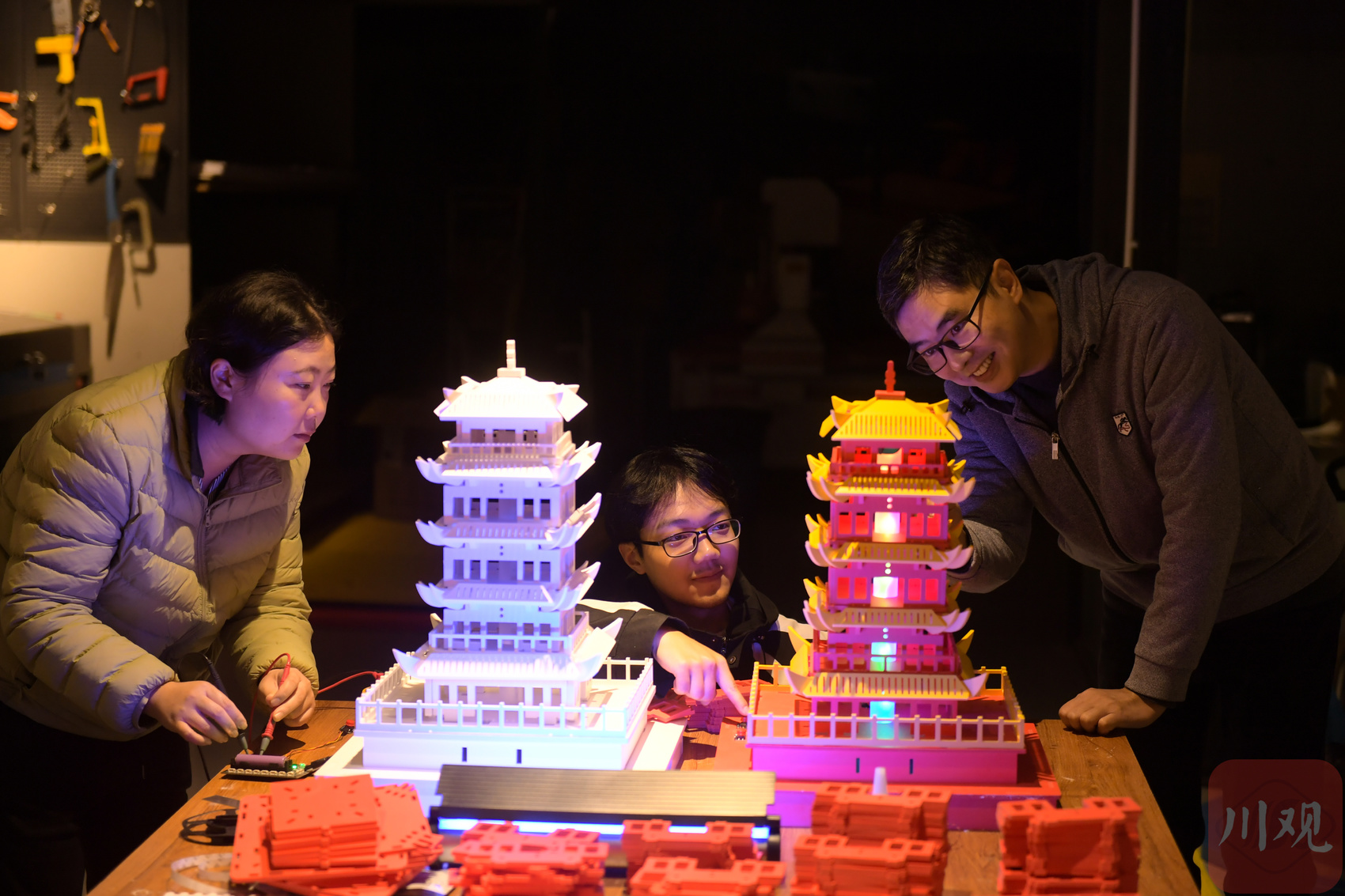 12月2日,记者走进位于成都双流区的电子科大科技园(天府园)D15栋——成电创客“造梦空间”。实验室内机器轰鸣、光束流转,激光切割机正高速运转,激光头在黄红两色雪弗板上灵活游走,精准勾勒出细密的建筑纹路。历经6小时雕刻、10小时组装粘接,再经上百次精准计算,223个雪弗板组件与电子元件完美契合,一座飞檐翘角、瓦片纹路纤毫毕现的“智能黄鹤楼”惊艳蜕变。借助软件编程赋能,这座高55厘米的微缩建筑不仅能实现LED灯光色彩变幻,还可通过AI语音播放诗词,古今交融间,尽显科技与文化的深度碰撞。