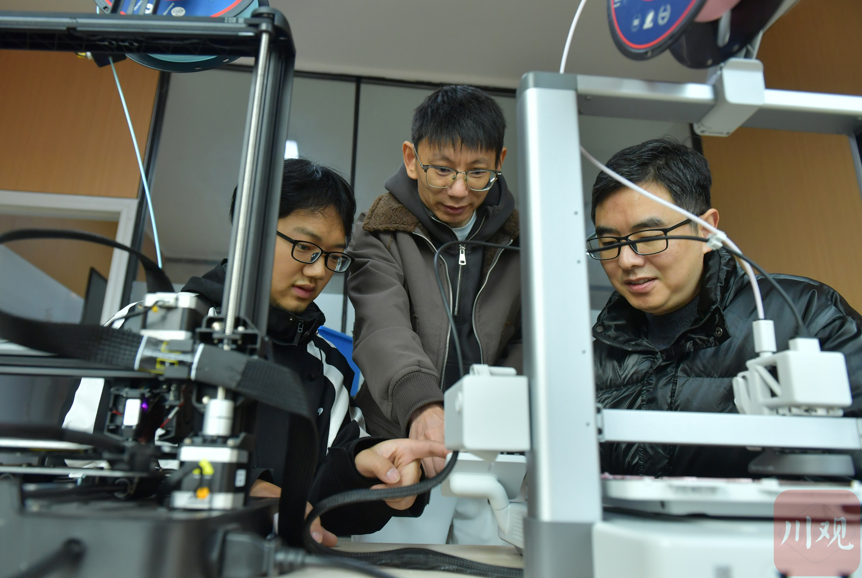 2025年12月2日,在位于四川省成都市双流区的电子科大科技园(天府园)成电创客基地,科创团队成员正在对研发产品运用到的零件进行3D打印技术探讨