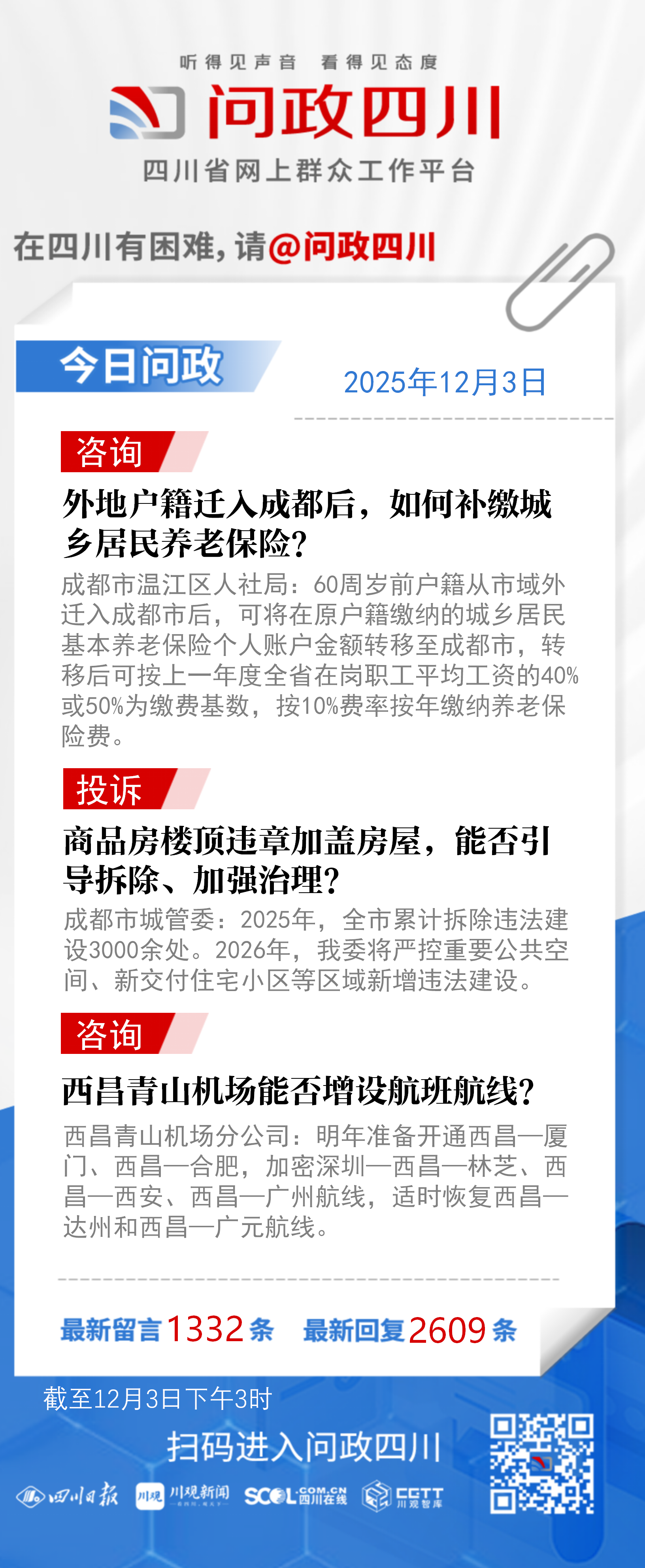 在四川有困难,找问政四川。如果您在四川遇到了操心事、烦心事、揪心事,请登录“四川省网上群众工作平台—问政四川”或拨打问政四川热线(028-96001)留言反映、求助或建议。我们将充分发挥平台的互动联系作用及舆论监督功能,第一时间传递民声,推动问题得以及时解决——听得见声音,看得见态度。