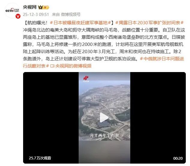 据@央视网 报道,冲绳岛北边的奄美大岛和扼守大隅海峡的马毛岛,战略位置十分重要。日本自卫队在这两座岛上的基地已显露雏形,意图构成整个西南诸岛堡垒群的北方支撑点。日媒披露称,马毛岛上将修建一条约2000米的跑道,计划将在这里开展美军航母舰载机陆上起降训练等活动。为赶在2030年3月完工,周末和夜间也在持续施工。除2条跑道外,岛上还计划建设可停靠大型护卫舰的系泊设施。