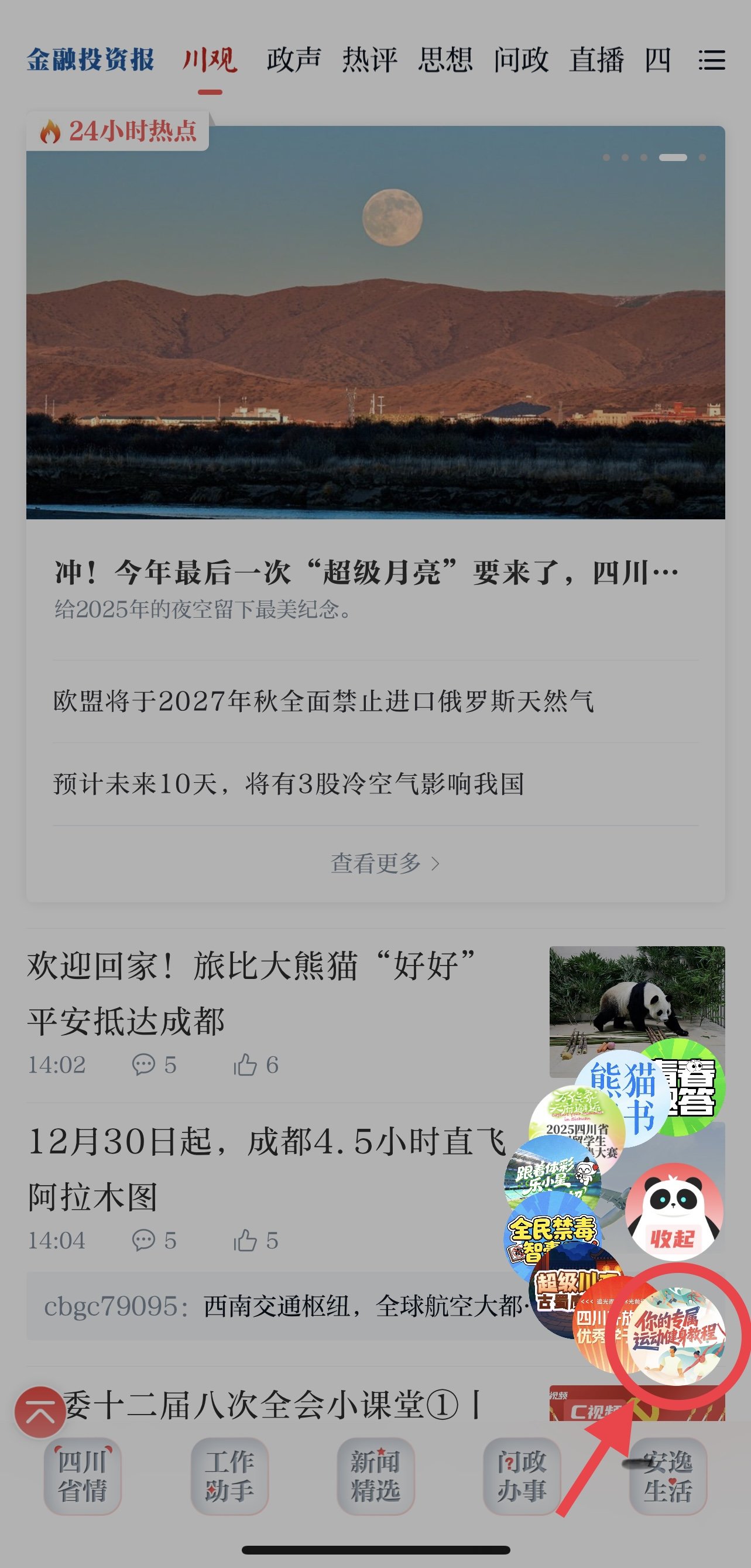 打开川观新闻App,首页右下角悬浮球选择“运动健身课程”按钮,点击即可进入课程。