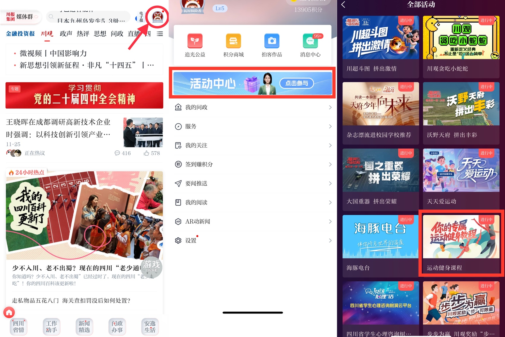 打开川观新闻App,首页右上角点击“我的头像”按钮,选择“活动中心”,进入找到“运动健身课程”,点击即可进入。