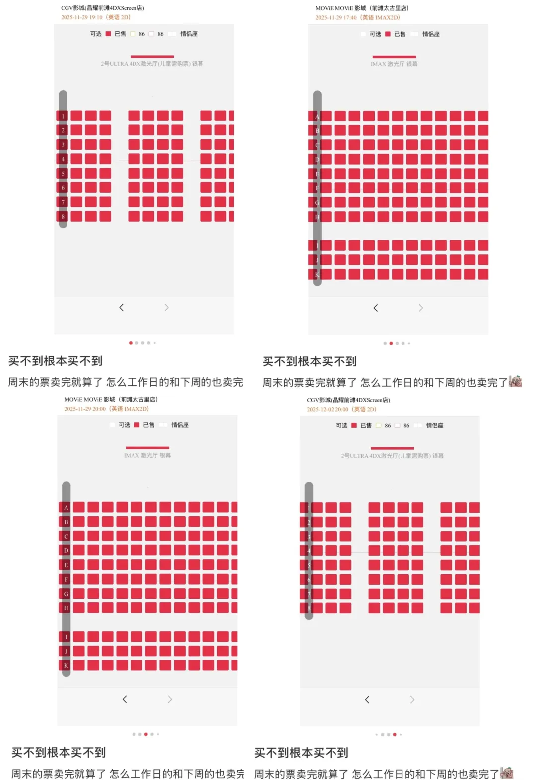 有网友发帖称,多个影院多个时段的票“买不到根本买不到”。