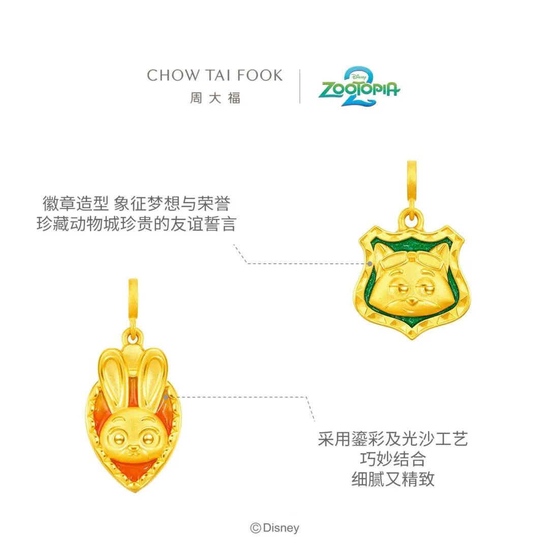 不过,单价“最贵”联名还要属周大福的“痛金”。据了解,周大福推出了4个系列产品,朱迪联名款胡萝卜黄金吊坠售价3280元,转运珠售价2380元。此外,老凤祥也推出了联名胡萝卜、爪爪、甜甜圈、豹警官等样式的金贴挂件。