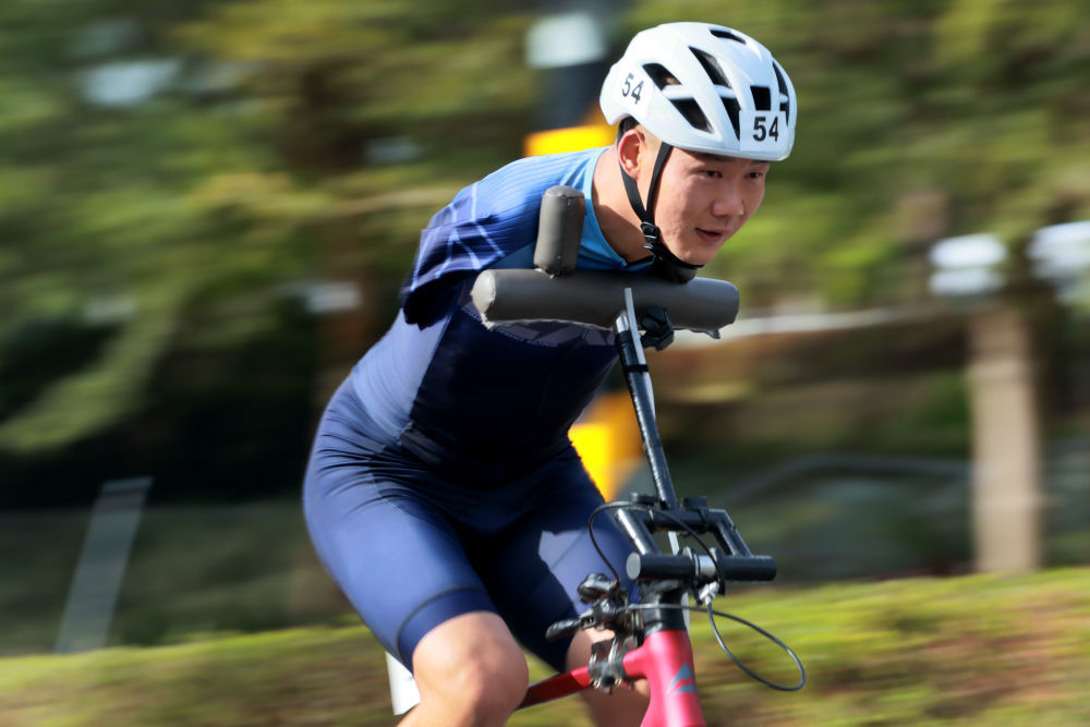↑11月27日,新疆队选手邓伟在男子PTS2级别自行车比赛中,最终他获得该级别铜牌。新华社发(刘春林摄)
