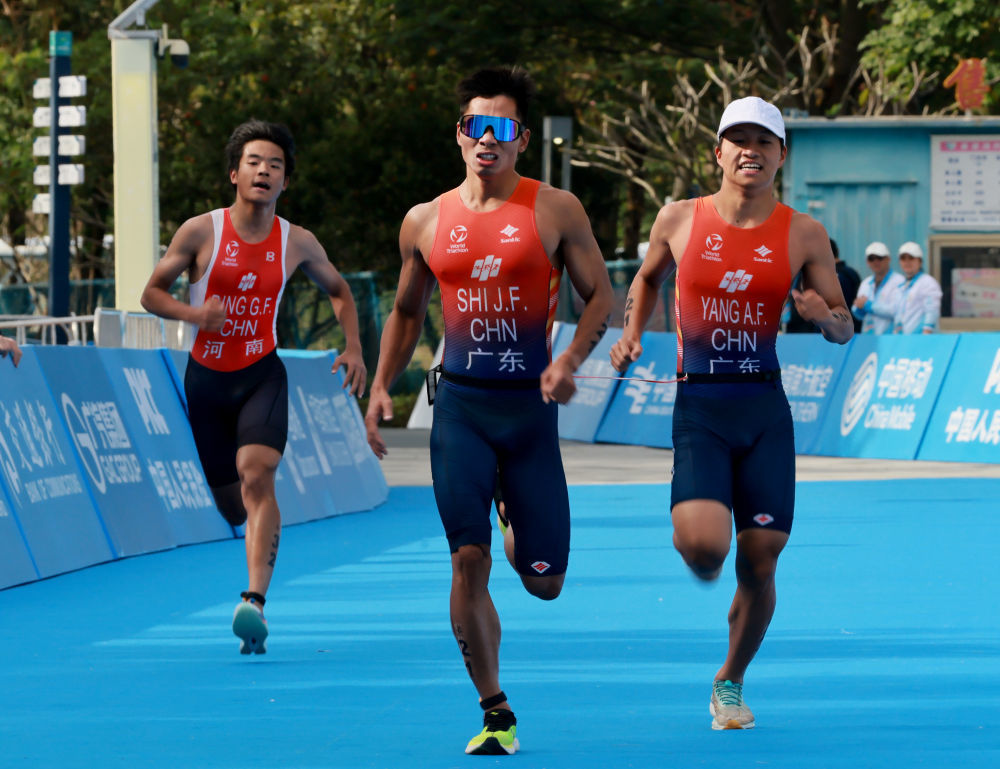 ↑11月27日,广东一团选手石金飞(中)与引导员杨奥富在跑步比赛中冲刺