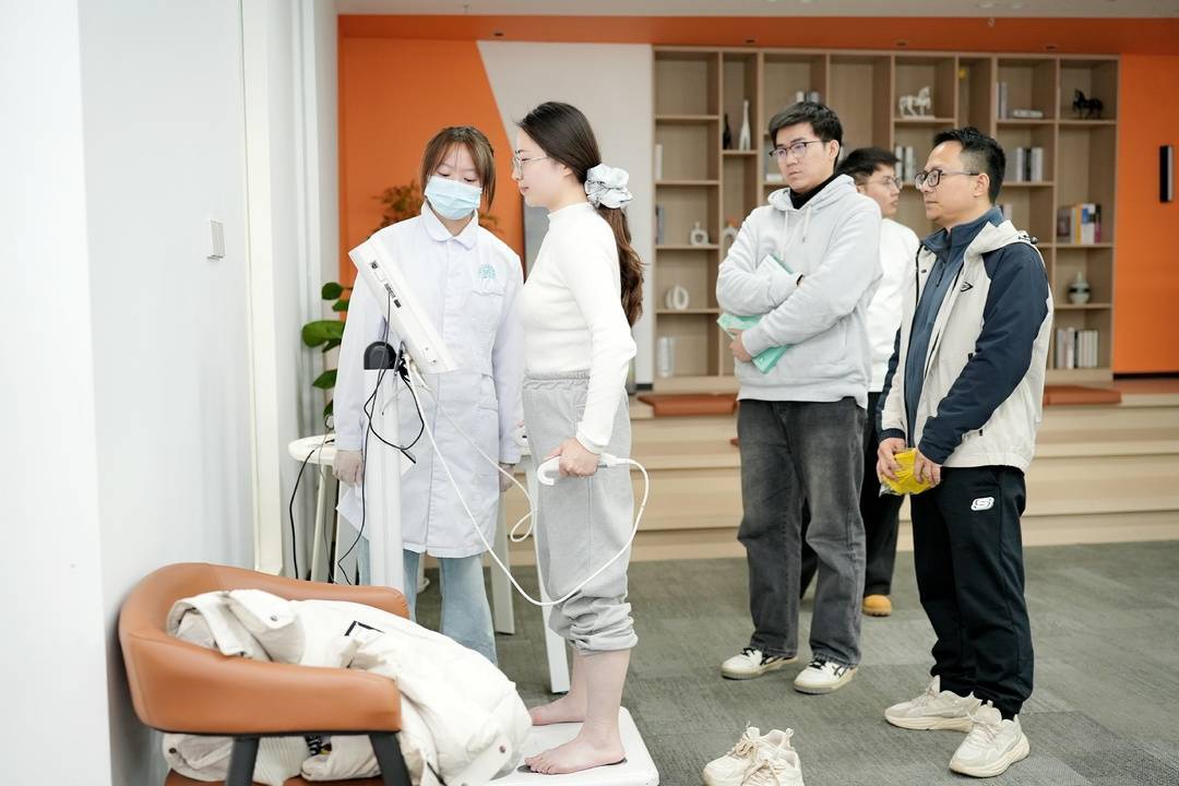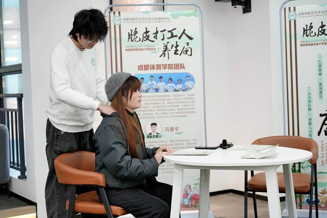 中心此次将健康服务“种”进商务楼宇,并非一次简单的“健康服务进企业”,而是经过系统规划、资源整合后的模式创新。职场人群具有工作节奏快、健康意识强但时间碎片化的特点,中心主动将服务阵地前移,除了提供常态化的血压血糖检测与健康咨询外,还联合成都体育学院专业团队共同推出“体医融合”健康管理服务,在楼宇内开展工间操、肩颈舒缓等科学运动指导,把“动起来”的健康理念与专业医疗资源带到职工身边。通过打造“楼宇里的健康会客厅”,中心不仅提供便捷可及的健康咨询与检测,更引入运动康复、功能训练等主动干预服务,切实帮助职场人群缓解“没时间运动”“不知如何科学锻炼”等现实困难。