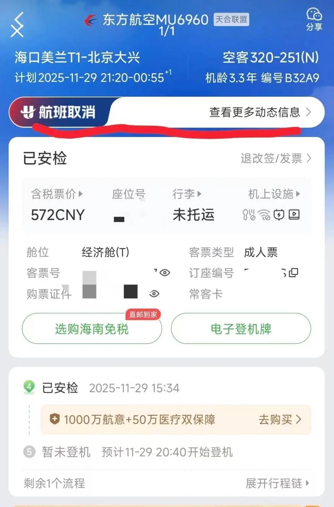 12月2日,重庆乘客小洋向封面新闻反映,他于11月29日准备乘坐东方航空MU6960航班从海口飞往北京时,刚过安检便收到来自航旅纵横的“航班取消”推送通知。