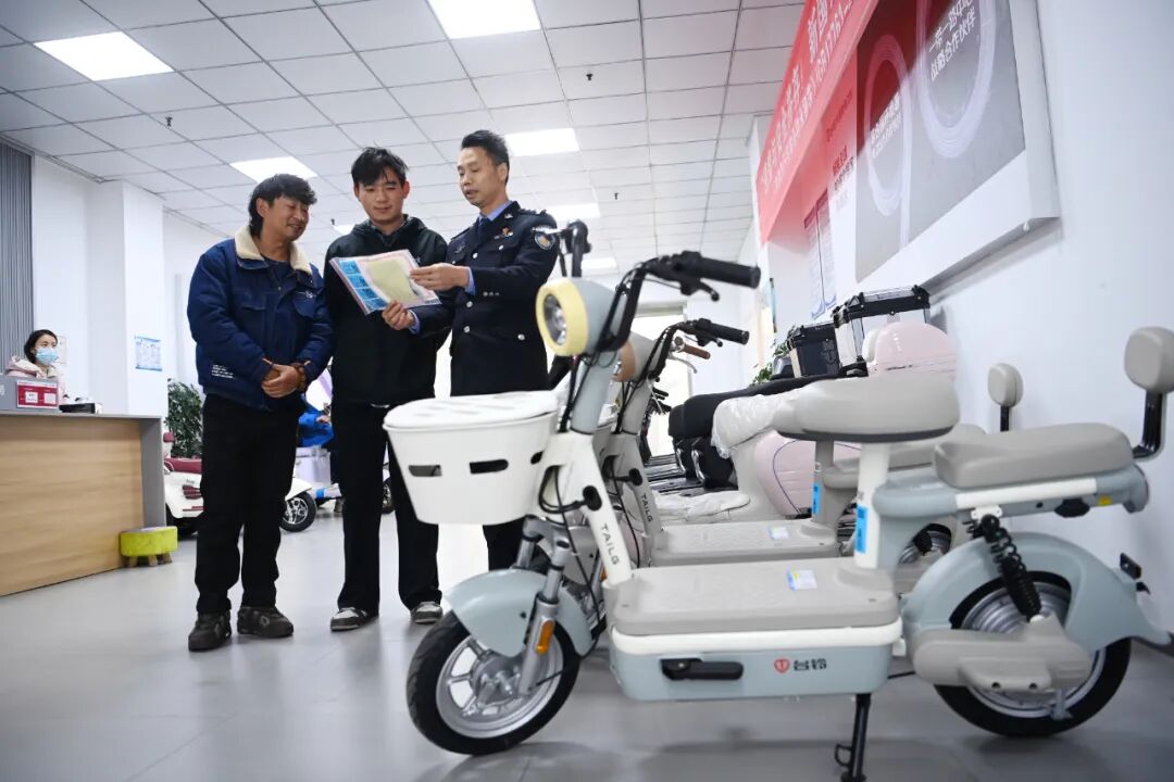 12月1日,湖北省襄阳市交警支队车管所民警在一家电动自行车销售点宣传电动自行车新国标。新华社发(谢勇摄)