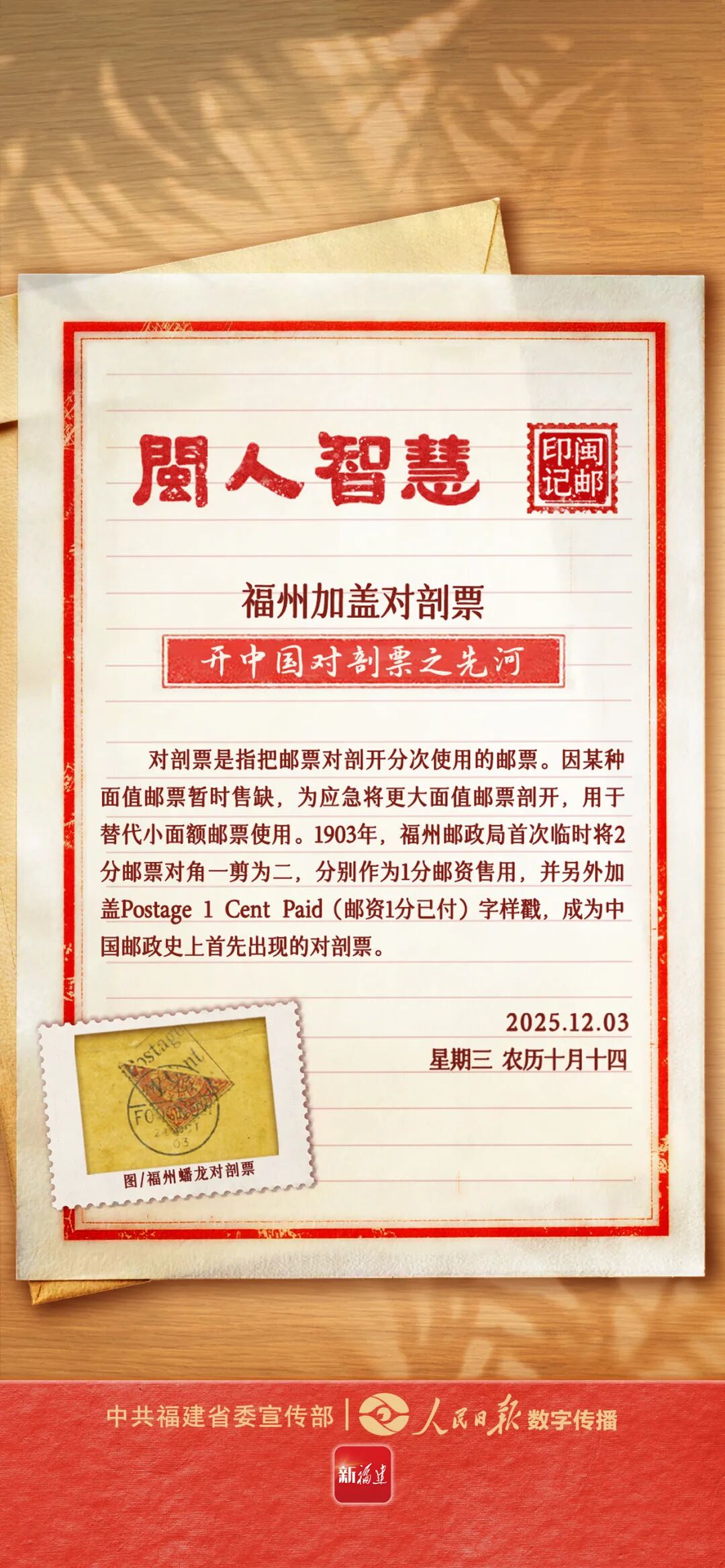 对剖票是指把邮票对剖开分次使用的邮票。因某种面值邮票暂时售缺,为应急将更大面值邮票剖开,用于替代小面额邮票使用。1903年,福州邮政局首次临时将2分邮票对角一剪为二,分别作为1分邮资售用,并另外加盖Postage 1 Cent Paid(邮资1分已付)字样戳,成为中国邮政史上首先出现的对剖票。