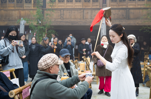“铮铮——”随着一阵悠扬的古筝声,一名身着汉服的表演者在台上演奏起悠扬的音乐。台下,长嘴壶高级茶艺师、非遗代表性传承人李丽舞动起长嘴壶,为现场的观众斟茶,优美的身姿和娴熟的茶艺引来一阵阵喝彩。
