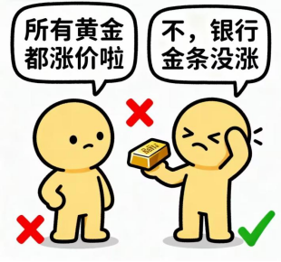 误区1:“所有黄金都涨价了”—— 假的!银行标准金条、黄金ETF价格没怎么涨,只金饰和非标准金条涨价;
