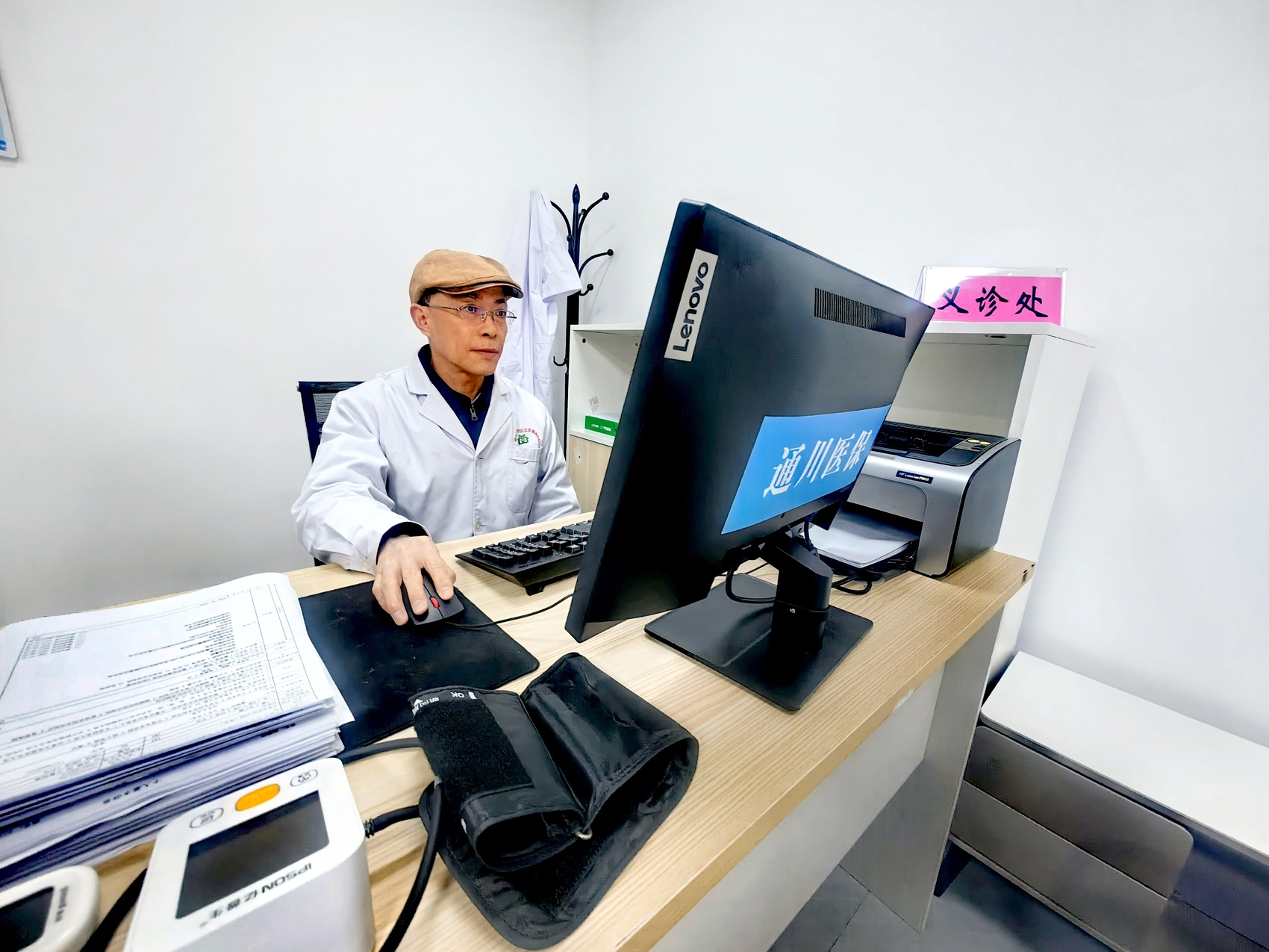 图为:凤西街道五里店社区医保服务站医生正在工作