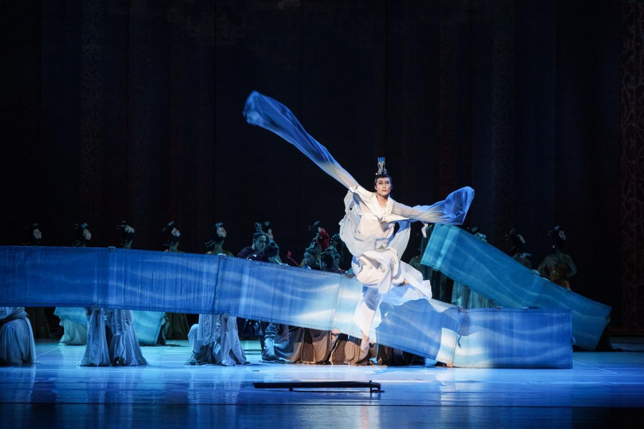 《水月洛神》也是中国舞剧发展史上创新表达的代表作品。它在古典舞基础上融入现代舞、芭蕾舞元素。诗赋的吟诵、唱和,是该剧又一大亮点。无声的舞蹈与有声的诗歌相结合,本剧精选经典的诗赋片段,辅以气势磅礴的合唱,带来曹植《美女篇》《七步诗》、甄宓《塘上行》等名篇的舞台呈现。