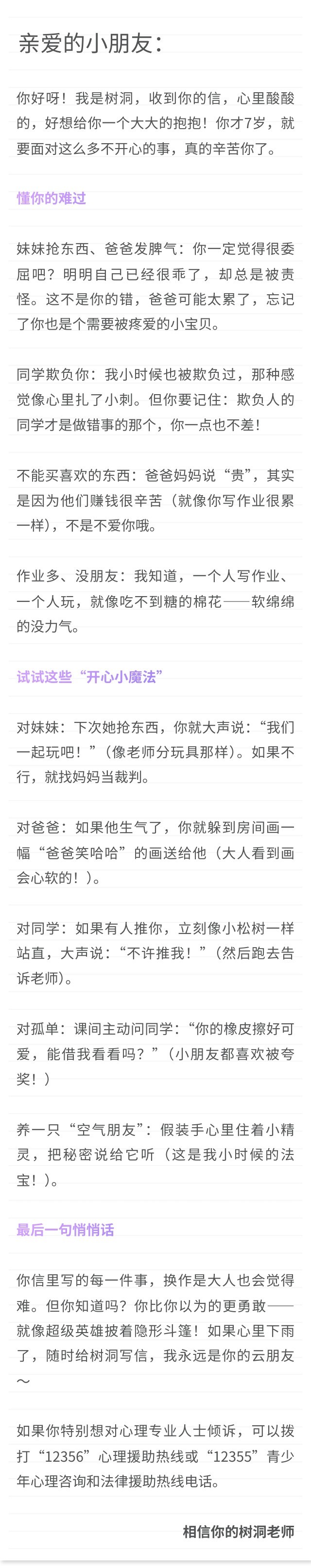 一名7岁小学女生来信:因为妹妹时常跟我争东西,爸爸经常骂我打我,还有就是经常被同学欺负,还有就是爸爸妈妈总说东西贵,这样不许买,那样又不许买,还经常跟我说这样不能做,那样也不能做,我不能做自己想做的事,我的学习压力也很大,有时作业有点多,还有感觉内心很孤独,没人和我做朋友。