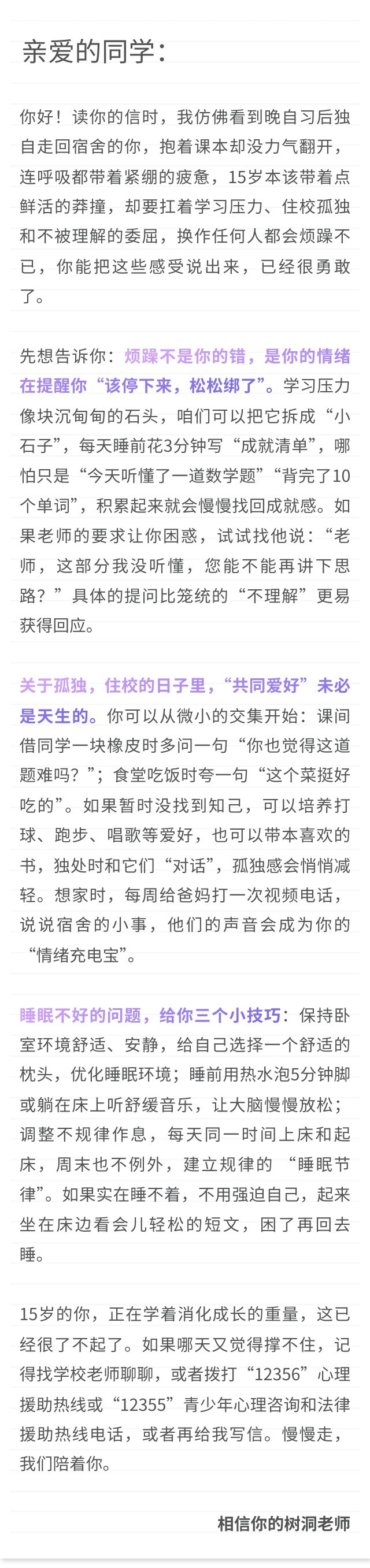 一位15岁高中男生:感觉烦躁,没有开心的事情!学习压力大,老师不理解,没有共同爱好的同学,三年住校,一个月才能回家一次,晚上睡不好。