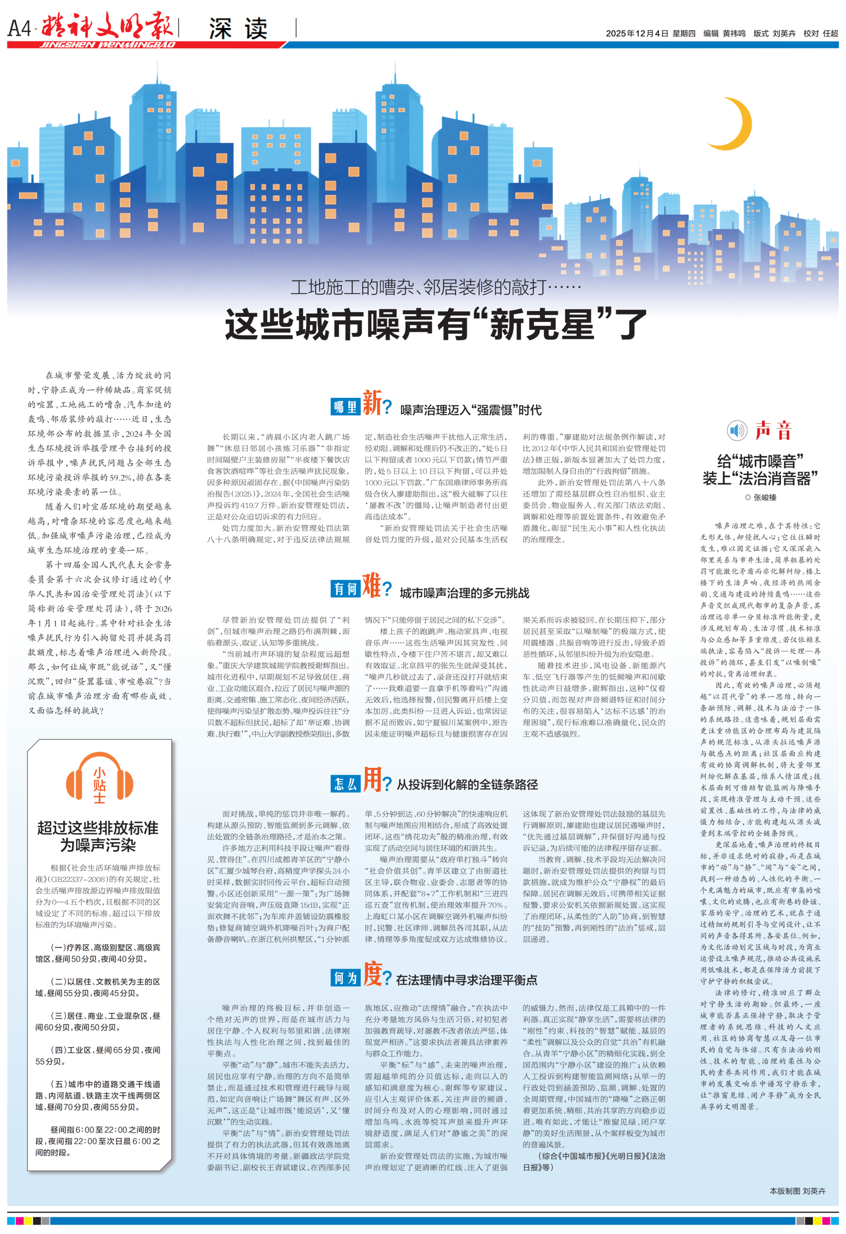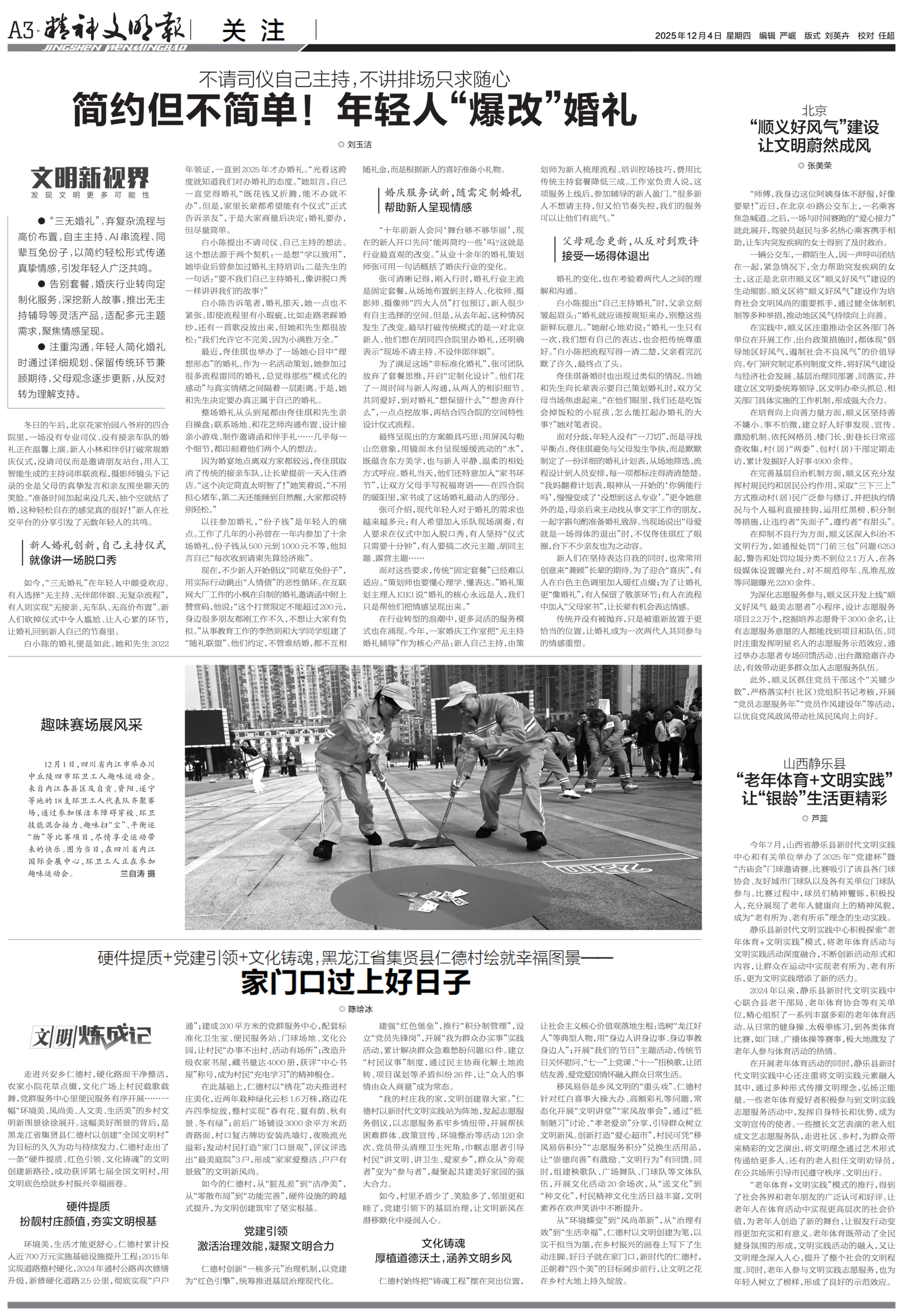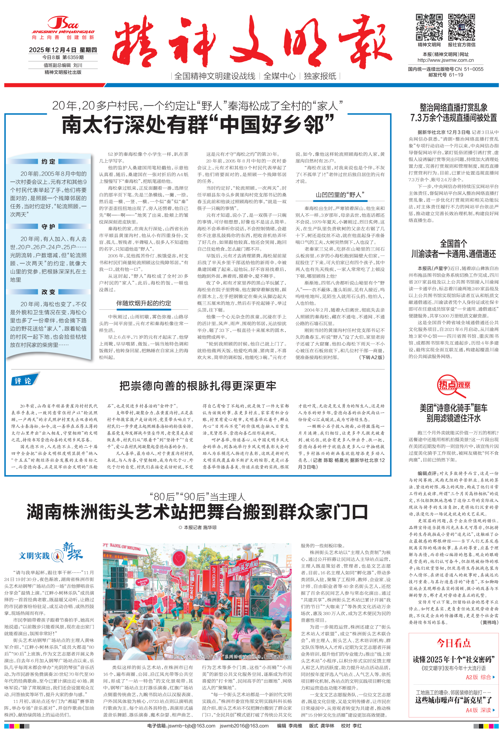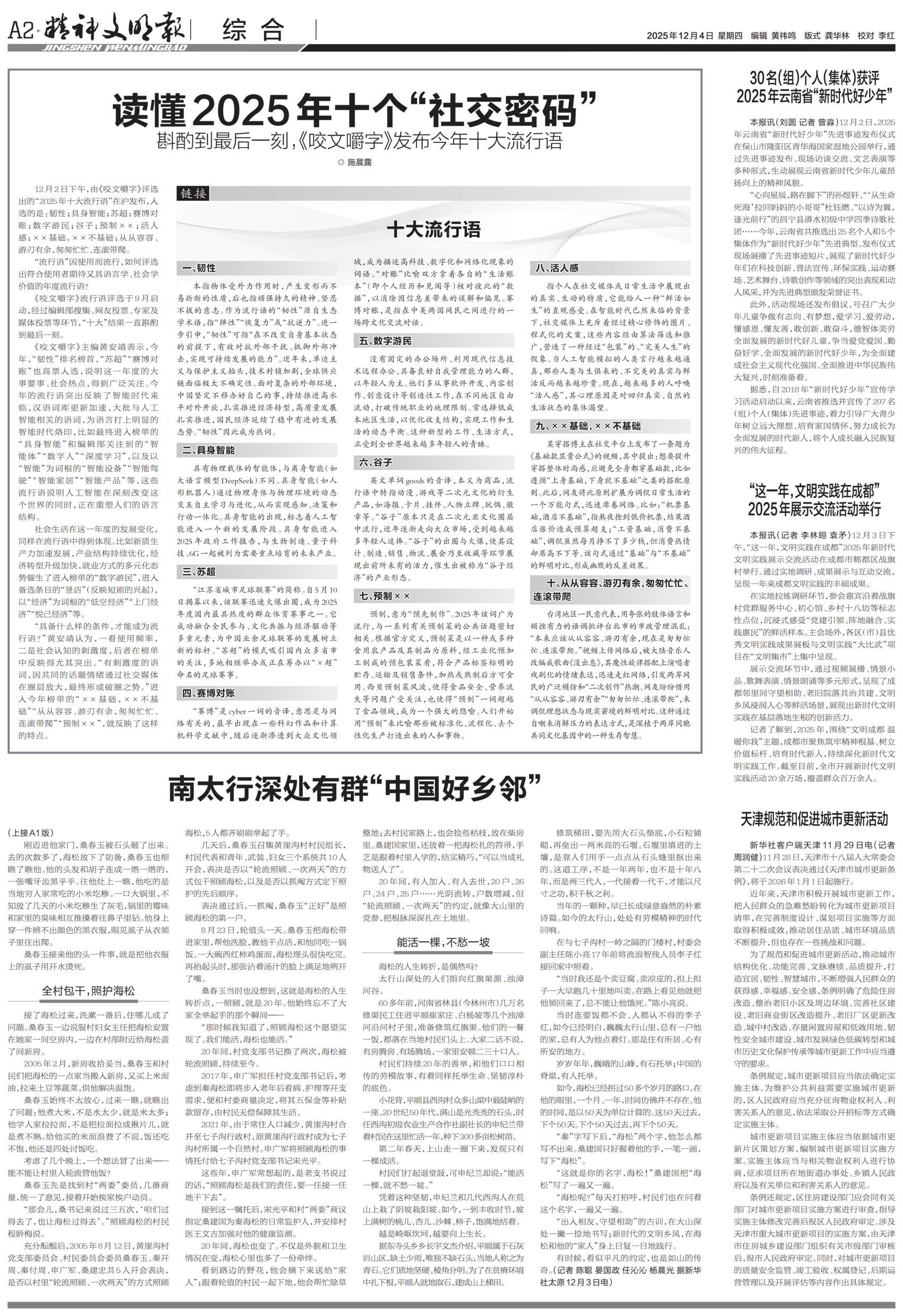 今日版面“早”知道:A1版头条走近南太行深处的“中国好乡邻”,看一个约定让“野人”秦海松成了全村的“家人”;《热点观察》栏目关注美团“诗意化骑手”翻车,别用滤镜遮挡住汗水;A2版头条了解《咬文嚼字》发布今年十大流行语,读懂2025年十个“社交密码”;A3版《文明新视界》栏目聚焦年轻人“爆改”婚礼,以简为美、以情为核的婚礼新风;A4版“深读”探索在城市的喧嚣与静谧之间,如何在法理情中寻求治理平衡点?