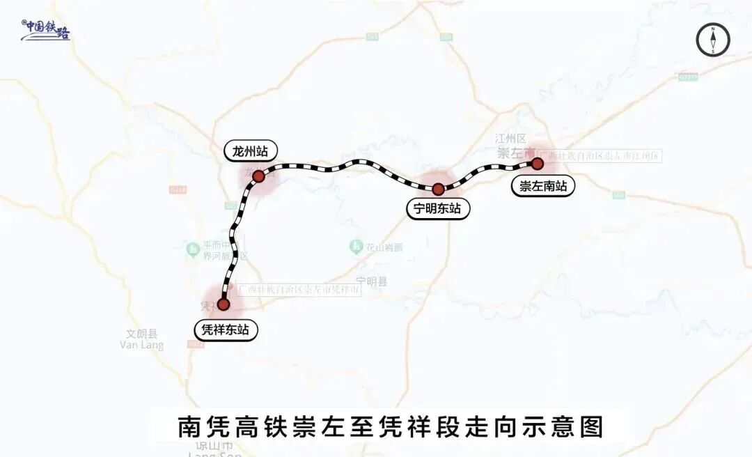 本次开通运营的南凭高铁崇凭段起自崇左南站,经崇左市,终至凭祥市凭祥东站,线路全长81公里,设计时速250公里。全线共设崇左南、宁明东、龙州、凭祥东站,其中崇左南站为既有车站,其他为新建车站。