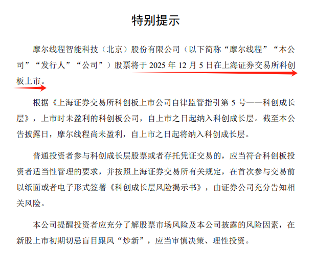 摩尔线程今日晚间公告,经上海证券交易所审核同意,摩尔线程智能科技(北京)股份有限公司发行的人民币普通股股票将于2025年12月5日在上海证券交易所科创板上市。