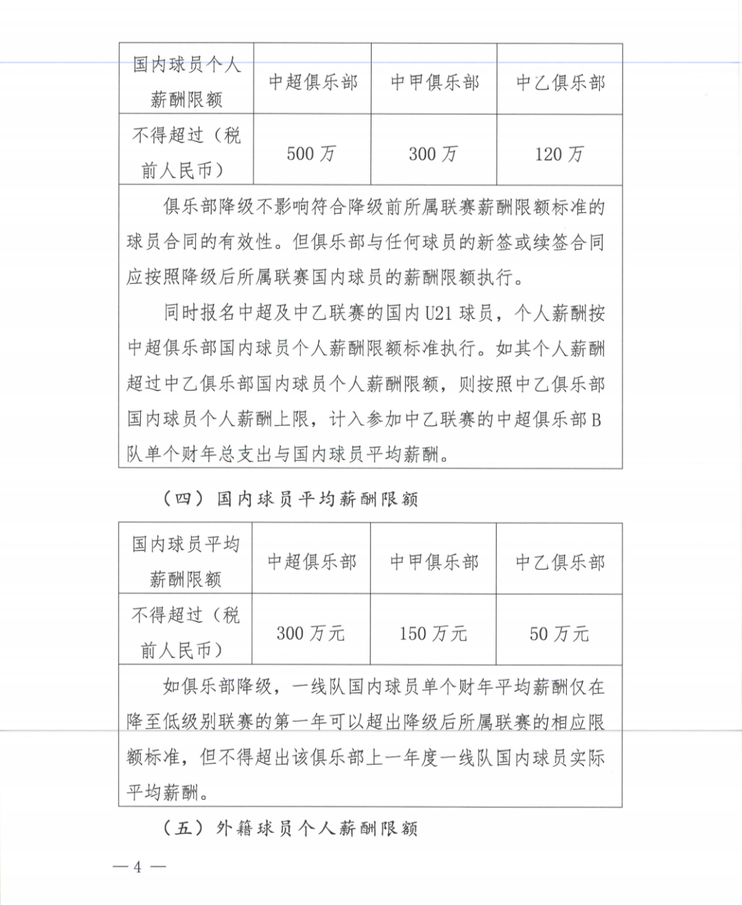 中超俱乐部国内球员个人薪酬不得超过500万元(税前),中甲国内球员个人薪酬不得超过300万元(税前),中乙国内球员个人薪酬不得超过120万。