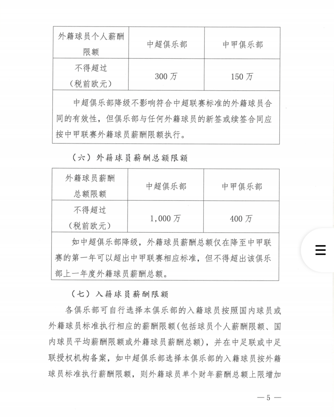 中超俱乐部外援个人薪酬不得超过300万欧元(税前),中甲俱乐部外援个人薪酬不得超过150万欧元(税前)。