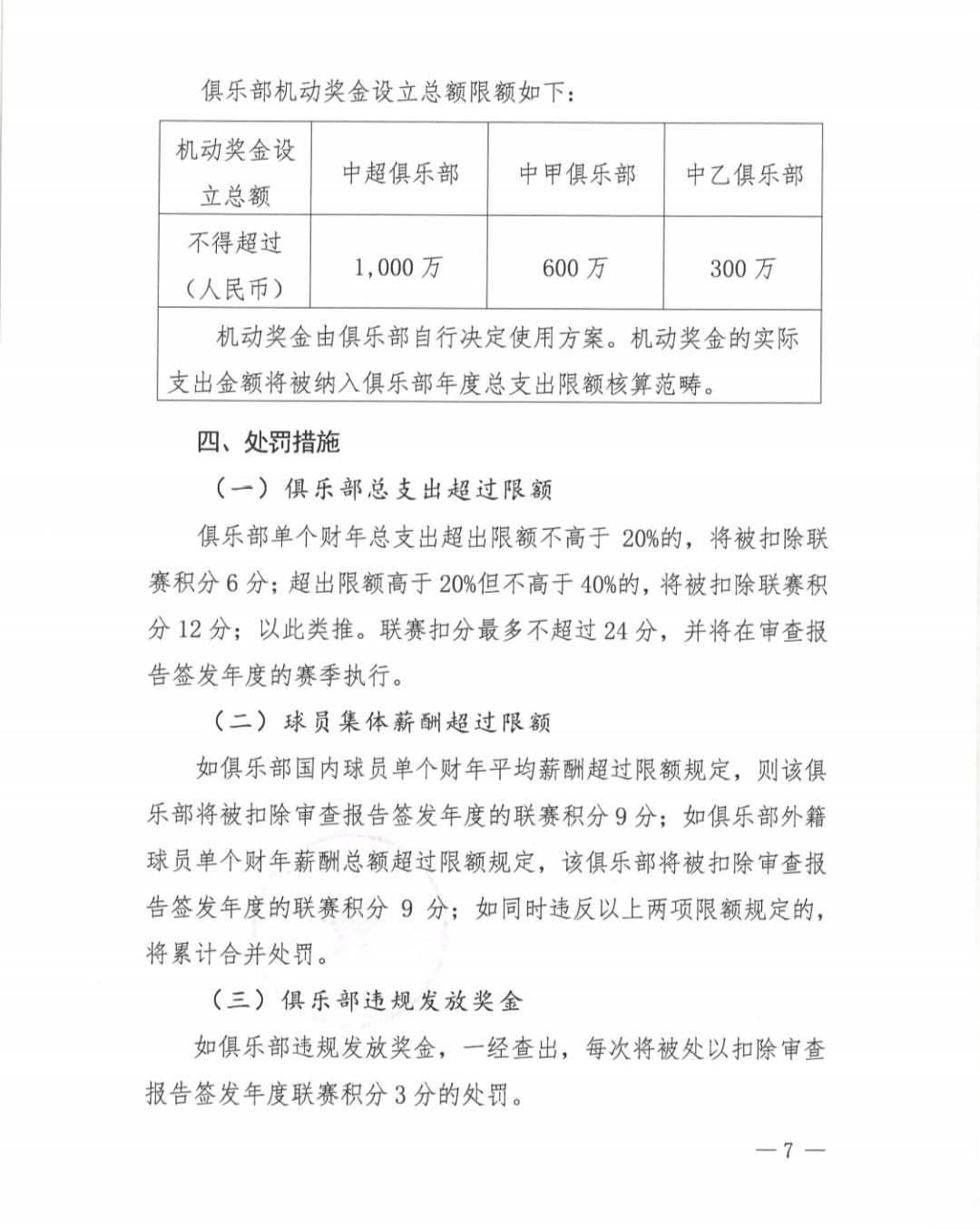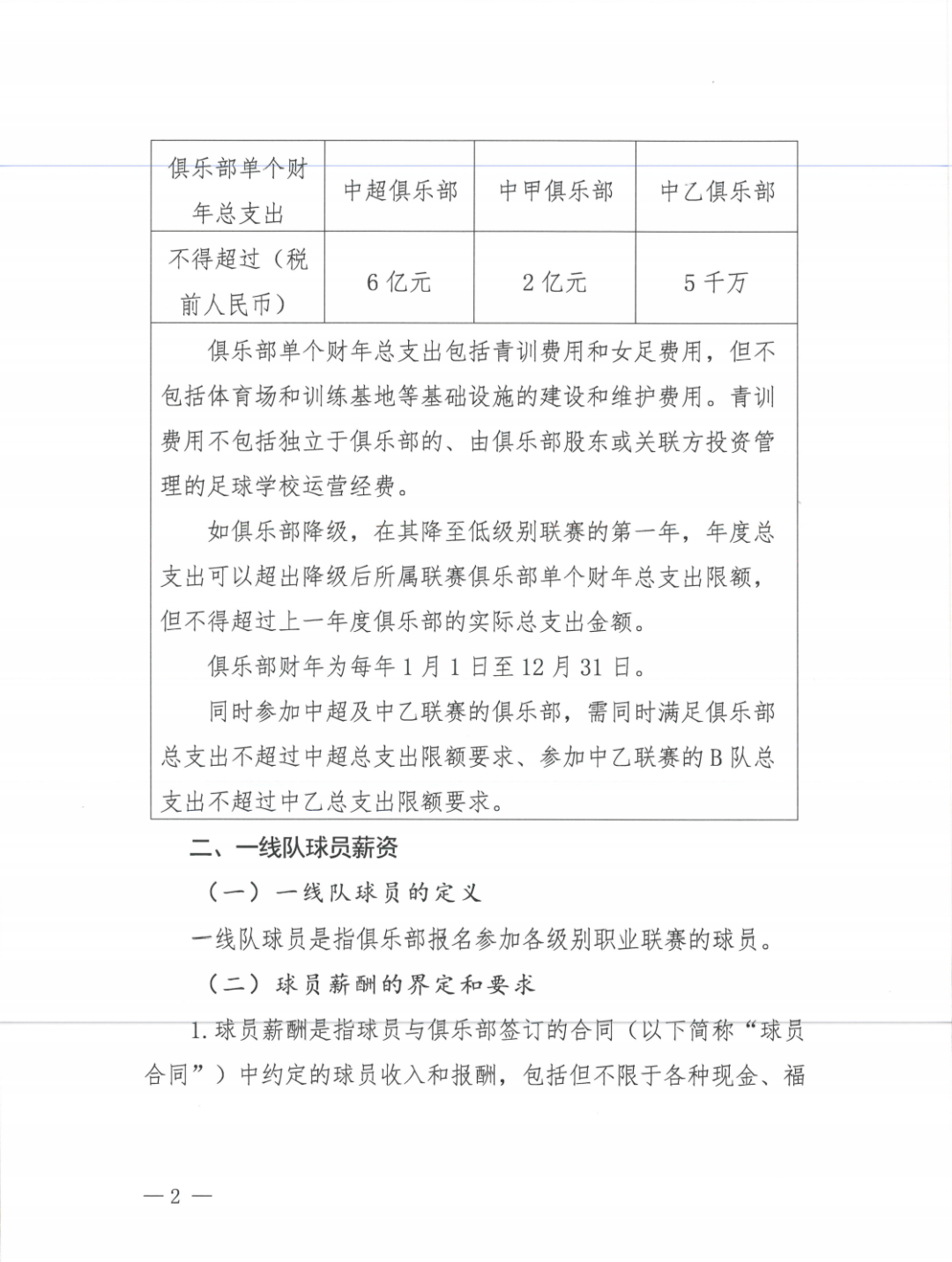 中超俱乐部外援薪酬总额不得超过1000万欧元(税前),中甲俱乐部外援薪酬总额不得超过400万欧元(税前)。中超俱乐部国内球员平均薪酬限额不得超过500万元(税前),中甲国内球员平均薪酬限额不得超过300万元(税前),中乙国内球员平均薪酬限额不得超过50万元(税前)。
