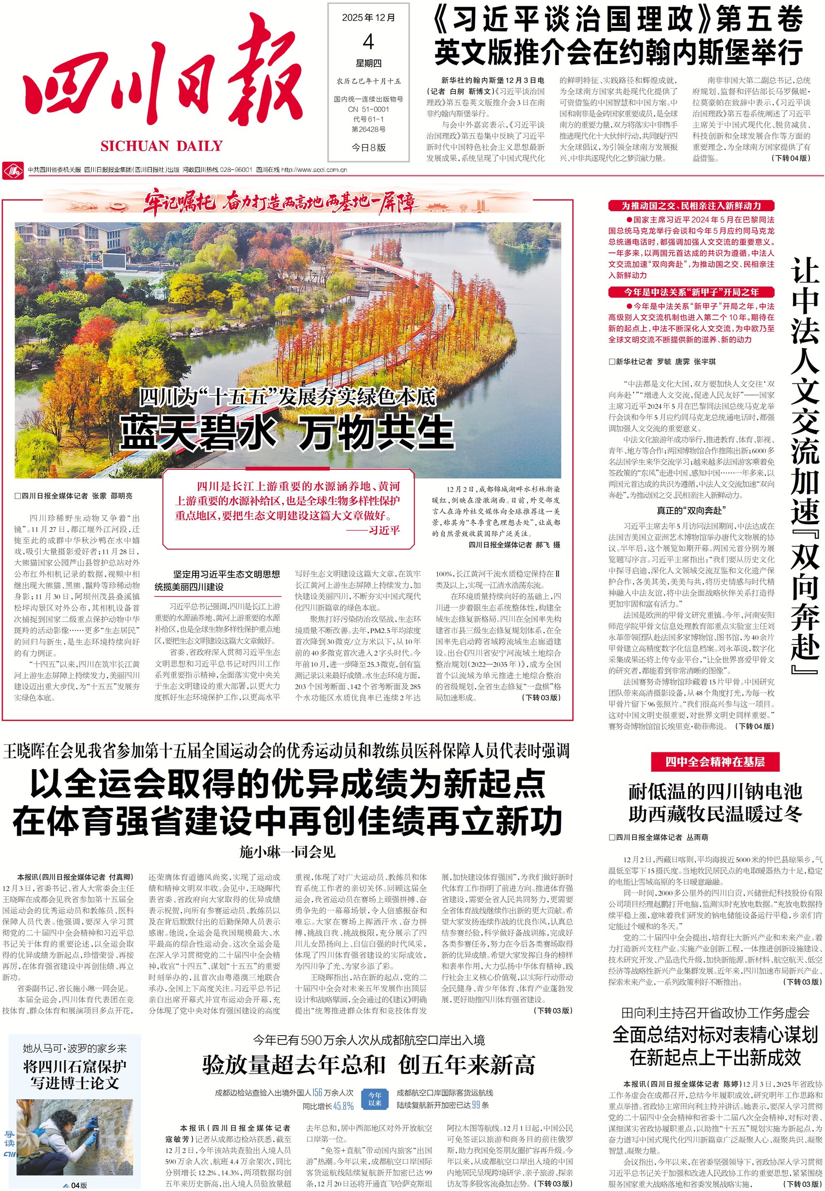 从“蓝天、碧水、净土”三大保卫战,到成立大熊猫国家公园修复栖息地、建设生态廊道,四川通过系统治理,不仅为生物多样性撑起坚实的“保护伞”,还带动了周边百姓增收致富,生动诠释了“保护即发展”。四川的这份生态答卷,你打多少分?今日头版,一起阅卷。