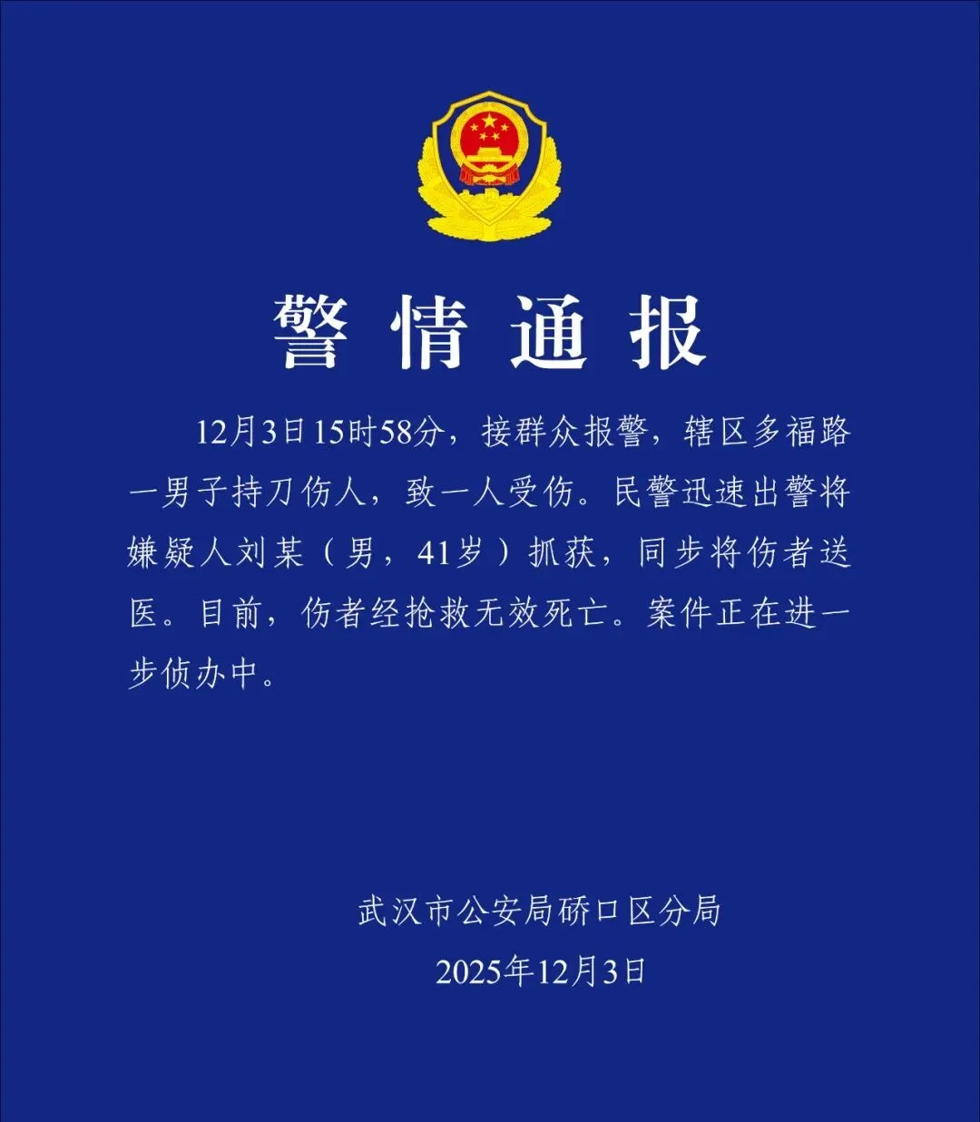 12月3日15时58分,接群众报警,辖区多福路一男子持刀伤人,致一人受伤。民警迅速出警将嫌疑人刘某(男,41岁)抓获,同步将伤者送医。目前,伤者经抢救无效死亡。案件正在进一步侦办中。