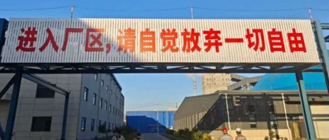 ▲工厂门头悬挂的“进入厂区,请自觉放弃一切自由”的大字标语,引发网友热议。图/潇湘晨报