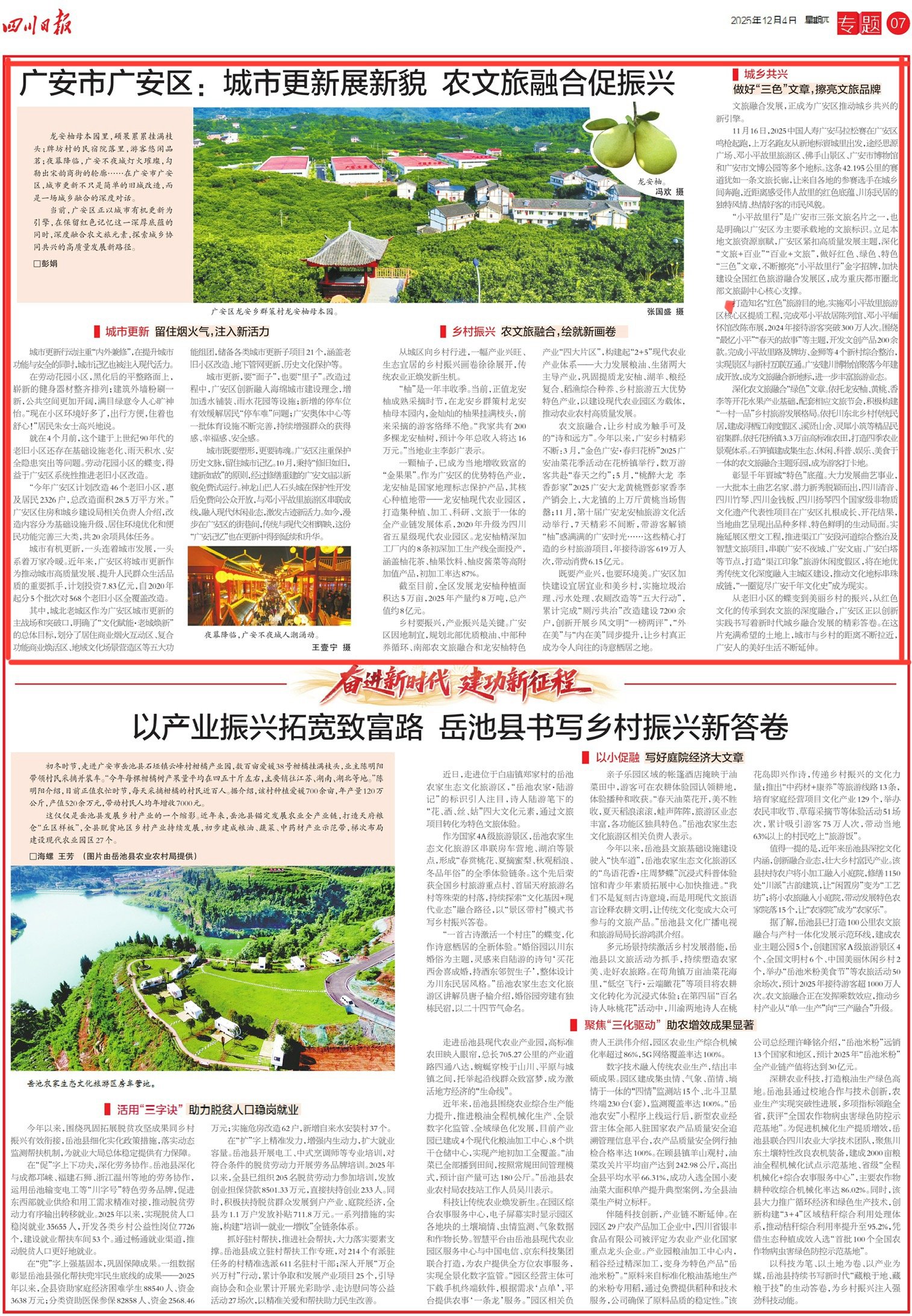 12月4日,《四川日报》刊发《广安市广安区:城市更新展新貌 农文旅融合促振兴》,川观新闻予以转载如下: