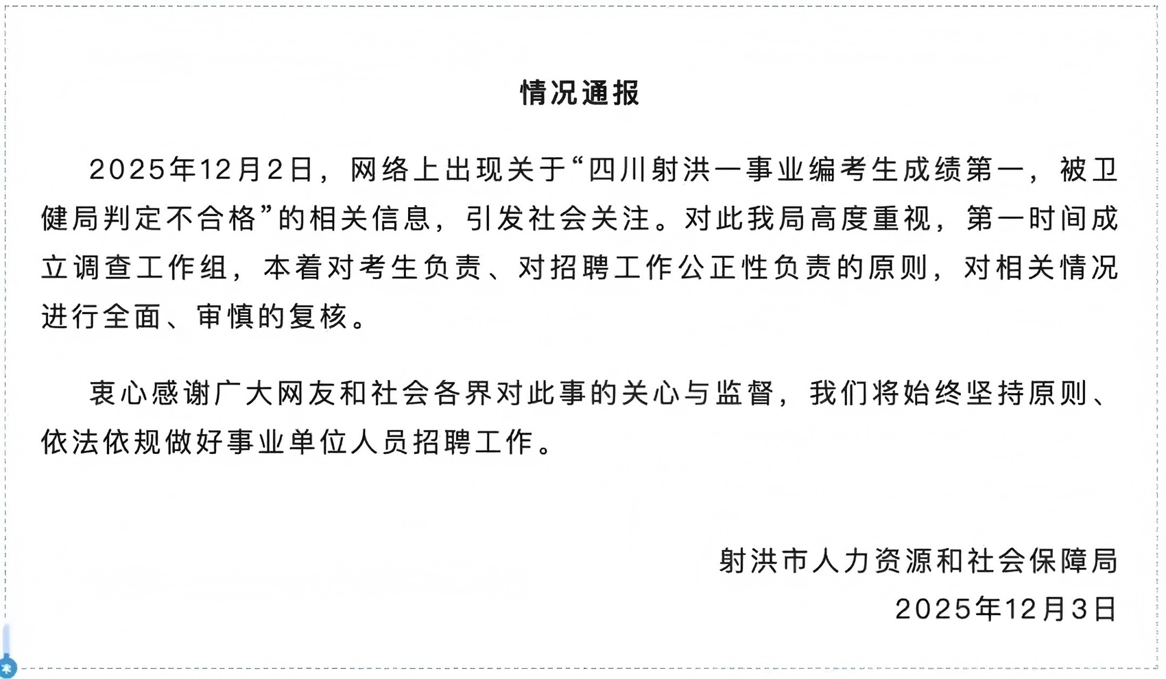 2025年12月2日,网络上出现关于“四川射洪一事业编考生成绩第一,被卫健局判定不合格”的相关信息,引发社会关注。对此我局高度重视,第一时间成立调查工作组,本着对考生负责、对招聘工作公正性负责的原则,对相关情况进行全面、审慎的复核。