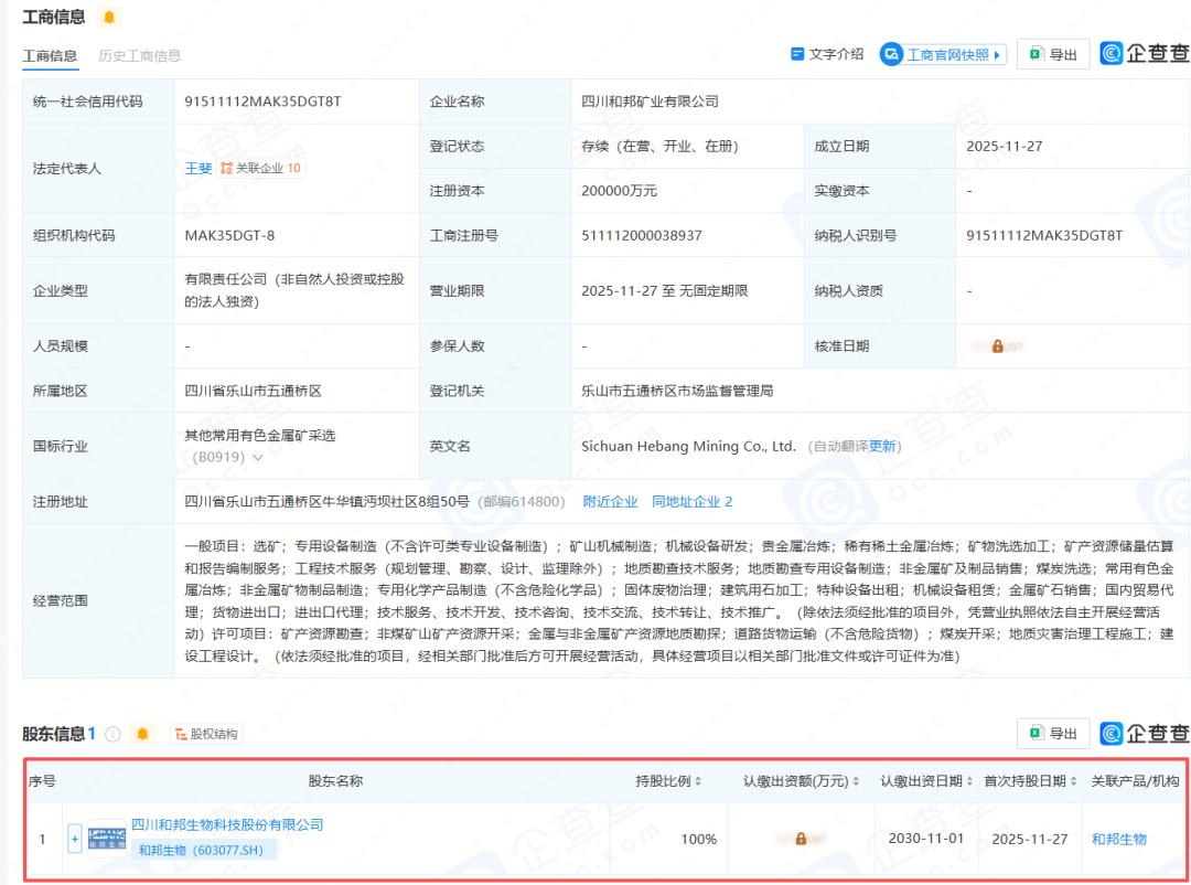 近日,四川和邦生物科技股份有限公司(下称“和邦生物”)完成了一项重大投资布局。企查查显示,和邦生物在四川乐山全资成立“四川和邦矿业有限公司”,注册资本达20亿元,法定代表人为王斐,经营范围覆盖矿产勘查、矿物洗选、煤炭加工、贵金属冶炼等全链条矿业服务。