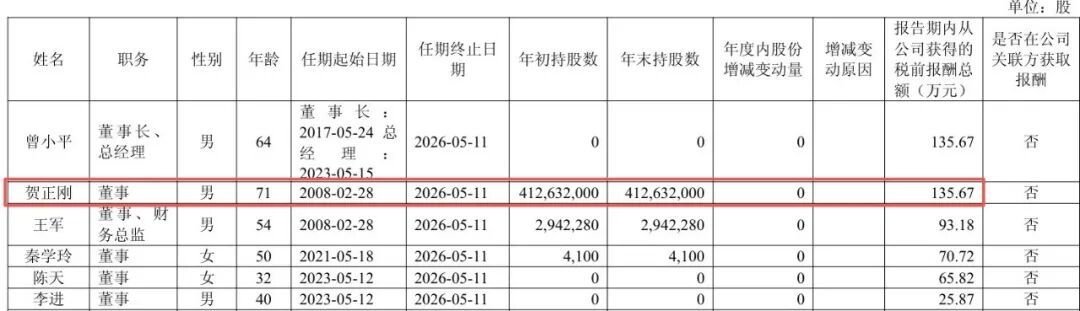 截至2025年6月30日,贺正刚合并持有和邦生物23.76亿股股份,占总股本26.91%。2024年他从公司获得税前报酬总额为135.67万元。