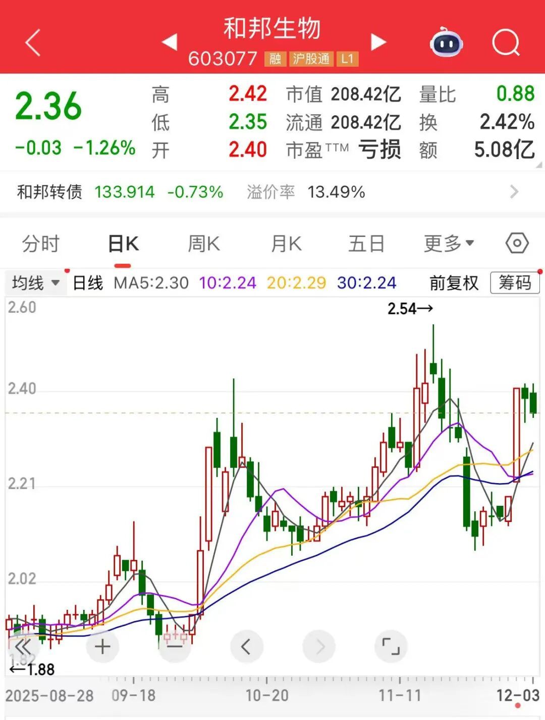 二级市场方面,截至12月3日收盘,和邦生物报2.36元/股,总市值208.42亿元。
