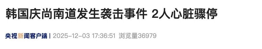 当地时间12月3日,韩国庆尚南道昌源市一旅馆发生无差别凶器伤人事件,造成2人心脏骤停,多人受伤。