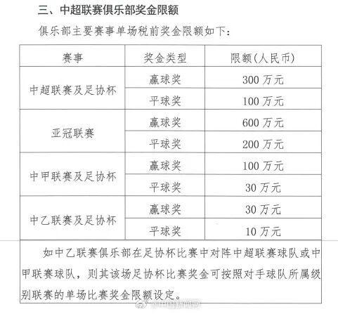 此外,中足联印发三级联赛财务指标,其中包含俱乐部奖金限额。中超球队联赛单场赢球奖金不得超过300万元。