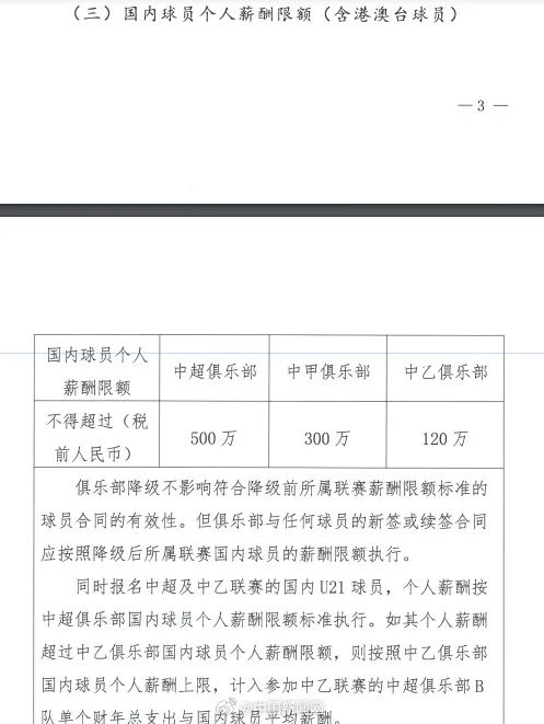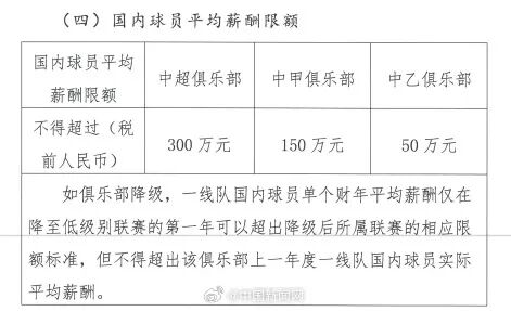 中国足球职业联赛联合会发布关于印发中国足球职业联赛俱乐部财务约定指标的通知。通知规定:国内球员年薪限额分别为500万(中超)、300万(中甲)和120万(中乙);国内球员平均薪酬分别为300万(中超)、150万(中甲)和50万(中乙)。